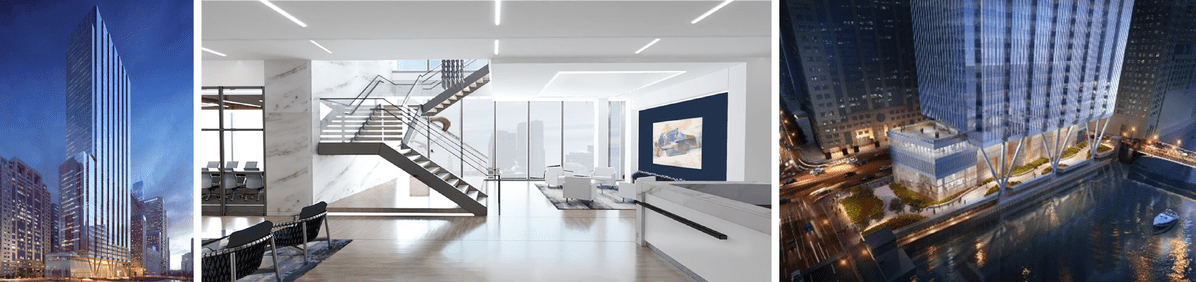 The 55-floor, Class A office building, also known as the Bank of America Tower, features the latest in building systems and telecoms infrastructure and expansive views of Lake Michigan and the Chicago River.