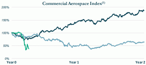 1) Commercial Aerospace Index includes AAR, Airbus, Boeing, HEICO, Safran and Triumph. Each time series has been indexed at the share price as of the first trading day during the initial year of each crisis, and compares share price fluctuations through the end of the following year.