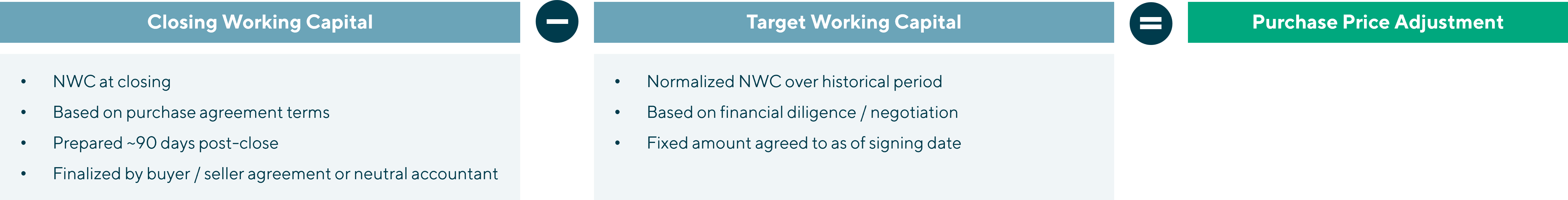 - Clarify consistency: Confirm whether the target and closing NWC will be calculated on the same accounting basis. If so, codify this treatment in an Accounting Principles schedule to the purchase agreement with an illustrative calculation of NWC.