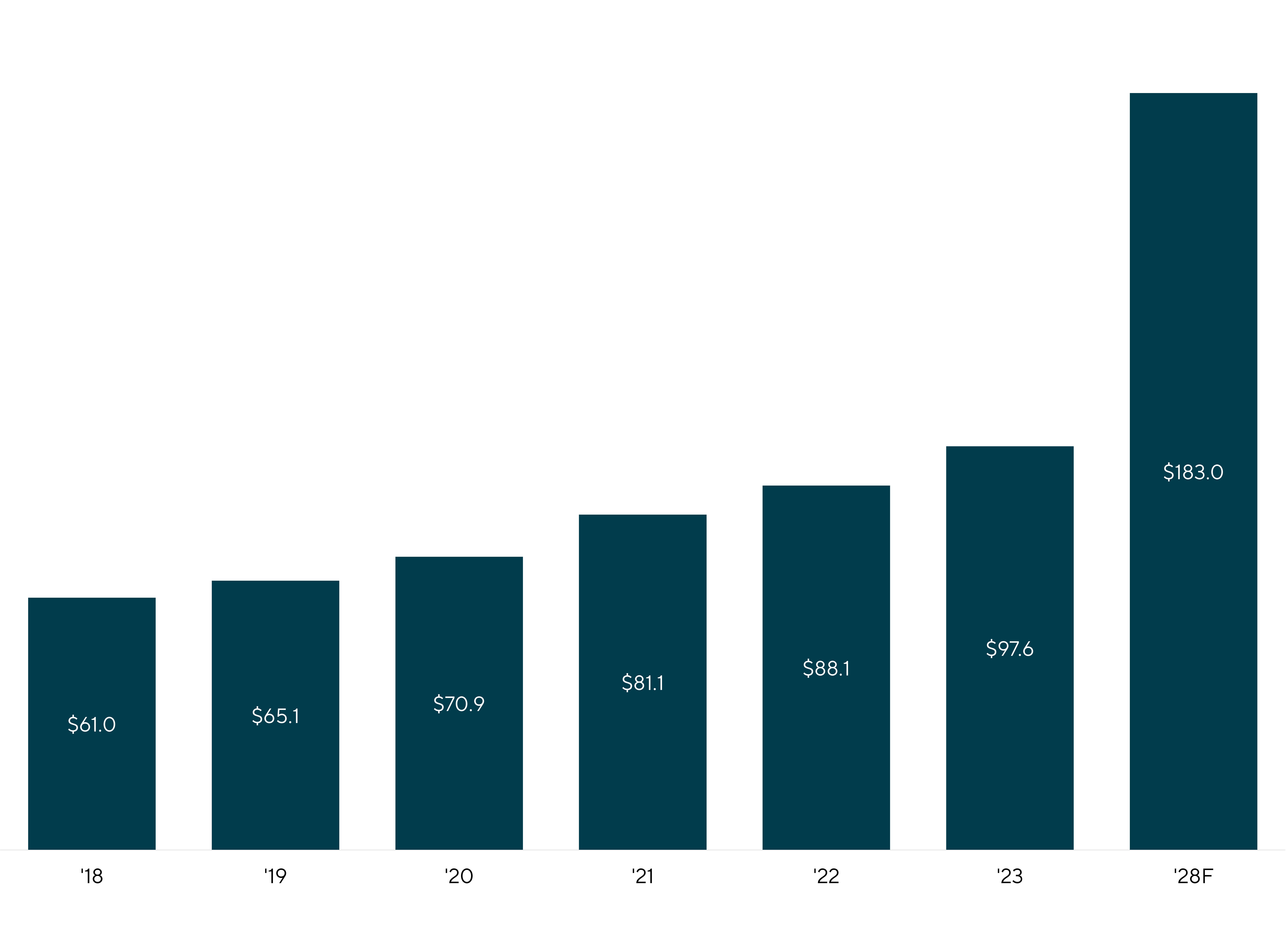 Data center capital expenditures, which reached ~$98B in 2023, are expected to grow at a compound annual growth rate (CAGR) of around 13% through 2028.1 Hyperscalers – companies that provide massive, scalable cloud infrastructure to support large-scale internet operations and storage needs – are leading market growth, investing substantial resources to position themselves as industry leaders. This significant expansion is driving a notable supply and demand imbalance of reliable services and high-quality products, presenting an opportunity for operators and investors in the space to generate immense value for their shareholders.