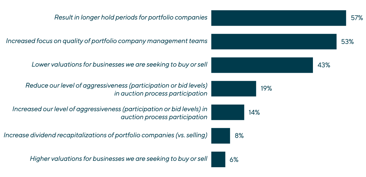 Nearly 60% of respondents to the survey indicated that they will have longer hold periods for their portfolio companies in 2023 as a result of the economic environment. For PE investors in consumer, the challenging economic conditions have caused many to redirect attention that would otherwise be given to M&A toward optimizing performance within their existing portfolio companies. In fact, 53% of respondents reported an increased focus on the quality of management teams, indicating that company leadership is more important than ever in successfully navigating macroeconomic uncertainty and preparing for future growth.