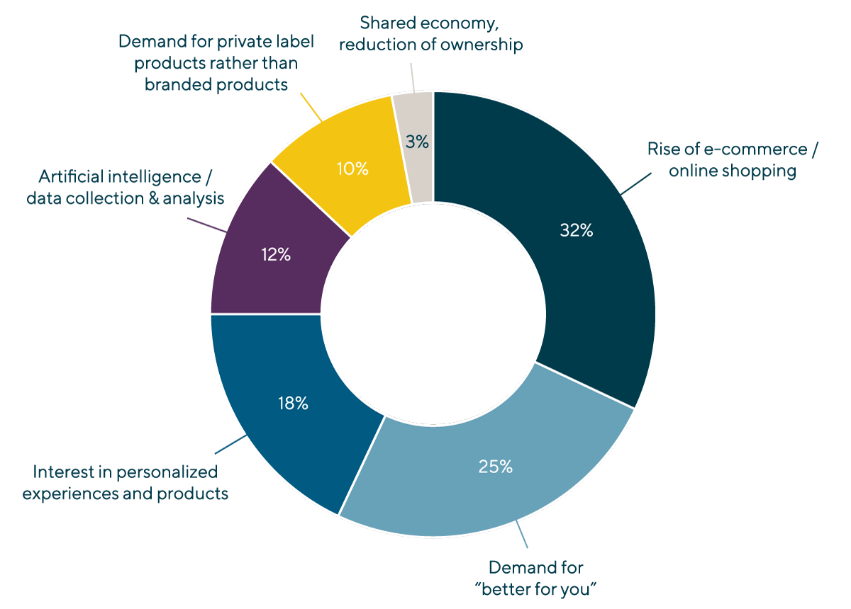 In addition to a move to e-commerce channels, “better for you” products and services continue to be top-of-mind for consumers in the post-pandemic era, with 25% of respondents indicating the trend will continue to drive change across the sector. Consumers prioritizing their health and wellness has translated into new opportunities for investor dollars not just in food and beverage, but across a host of consumer subsectors, such as beauty, that are offering innovative offerings to align with “better for you.”