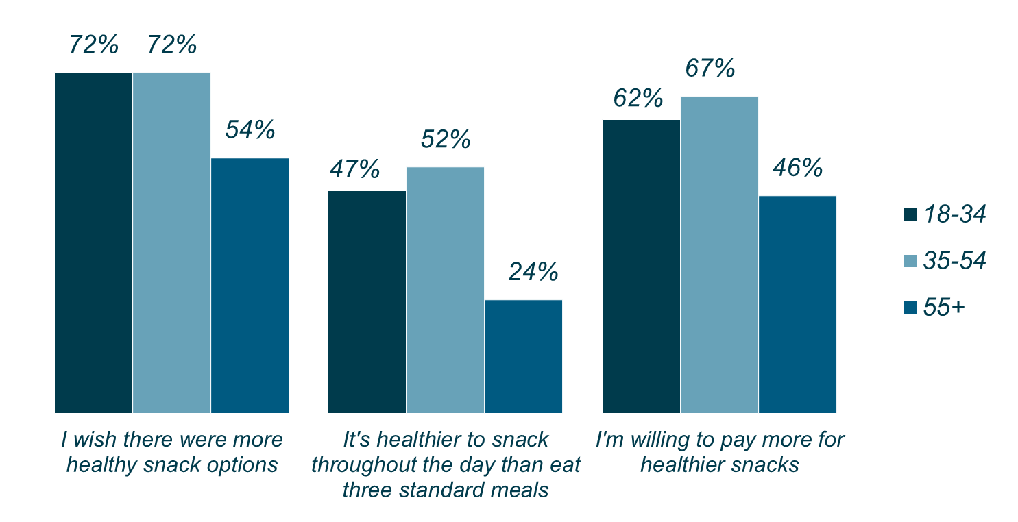 • Strong demand for healthy snack options—and a majority of consumers aged 18-54 are willing to pay more for healthier snacks