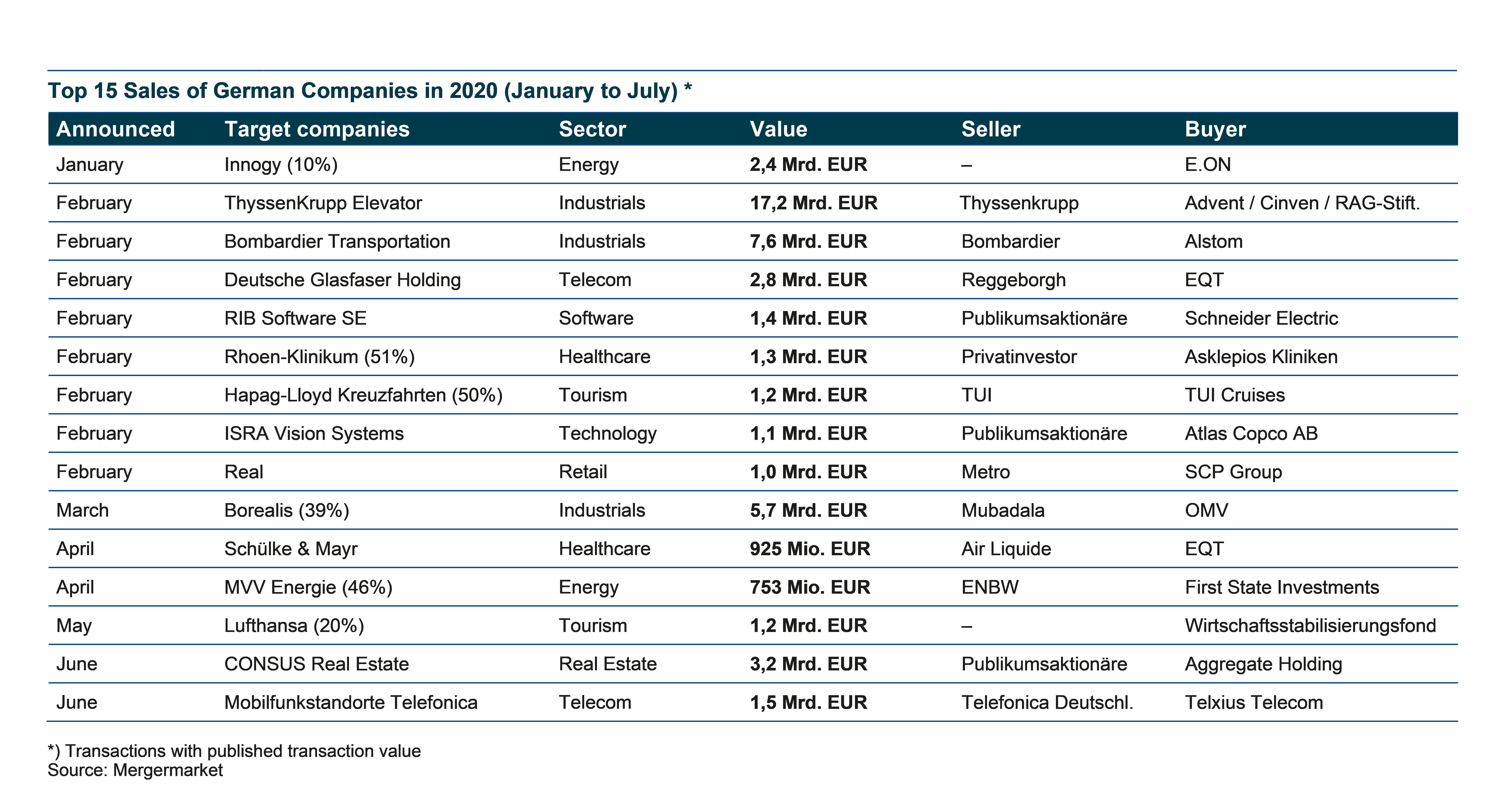 | Thus, strategic buyers, especially large foreign companies, are once again able to act and make decisions, even if they are still relatively cautious and wary in ongoing M&A processes. In addition, financial investors continue to be under strong investment pressure; after all, the private equity industry has not forgotten that the most successful investments were made immediately after the financial and economic crisis of 2008/09. As a result, we expect a noticeable pick-up of deal activity in Germany after the summer break, not only as a result of catch-up effects.