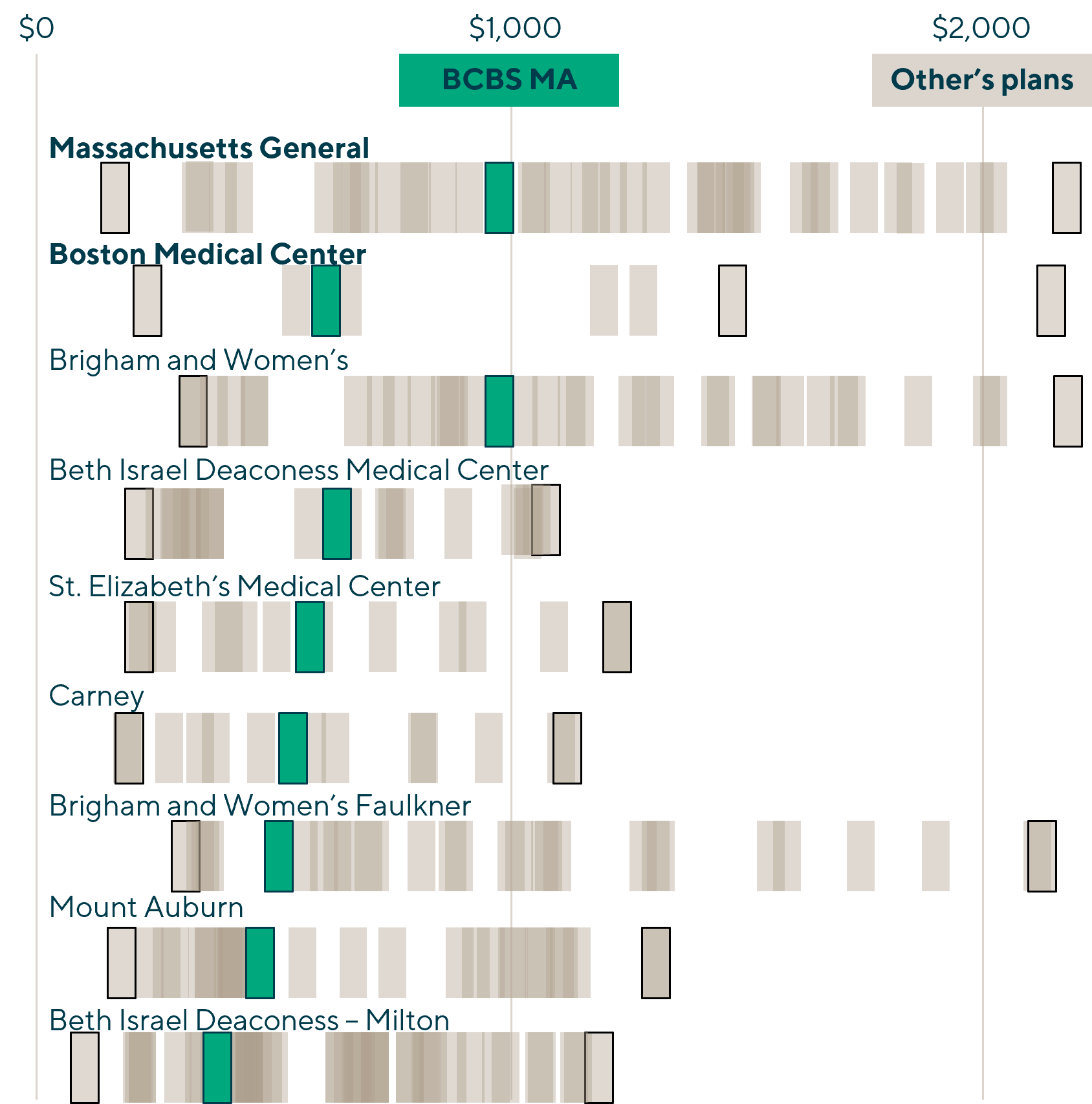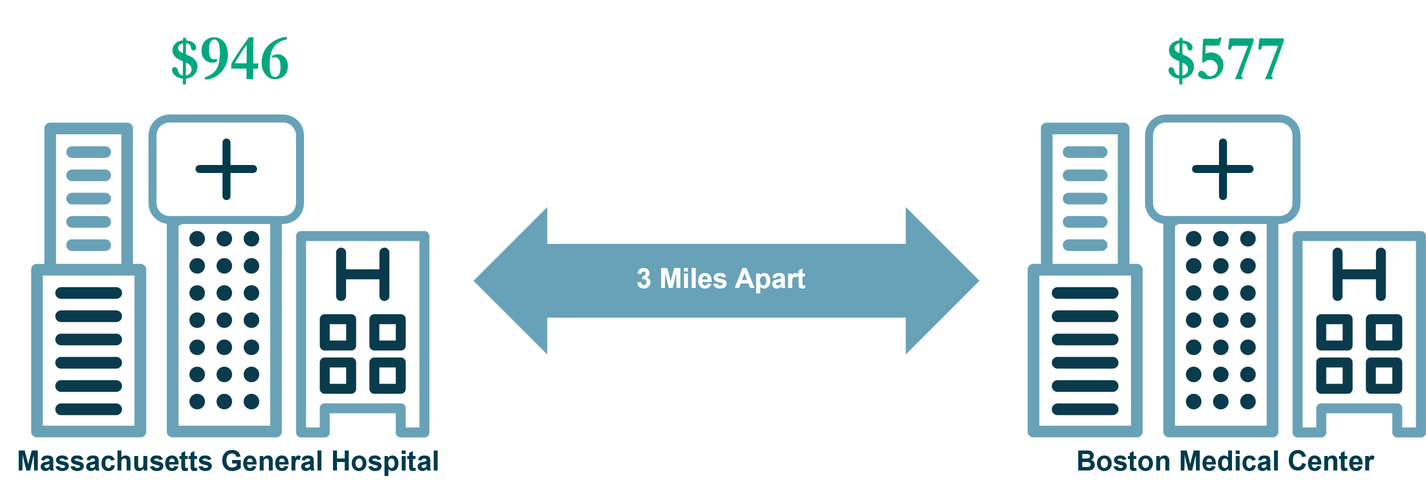 Another example of the wide variation in pricing exposed by the NSA can be seen by comparing a common service in a specific geography. The same insurance network (Blue Cross Blue Shield of Massachusetts [BCBS MA]) has negotiated two materially different rates with two very similar providers: