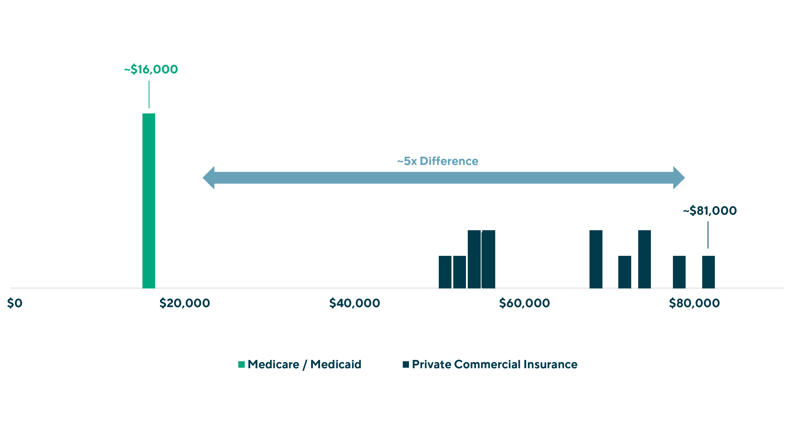 In this example, commercial insurance plans are paying up to five times Medicare and Medicaid reimbursement, and often times even higher than “cash pay” or what an uninsured patient would be billed by the hospital(7). This variation is present despite Sutter performing the same procedure, at the same facility with the same group of physicians with commercial networks purportedly having the scale and expertise to negotiate competitive rates.