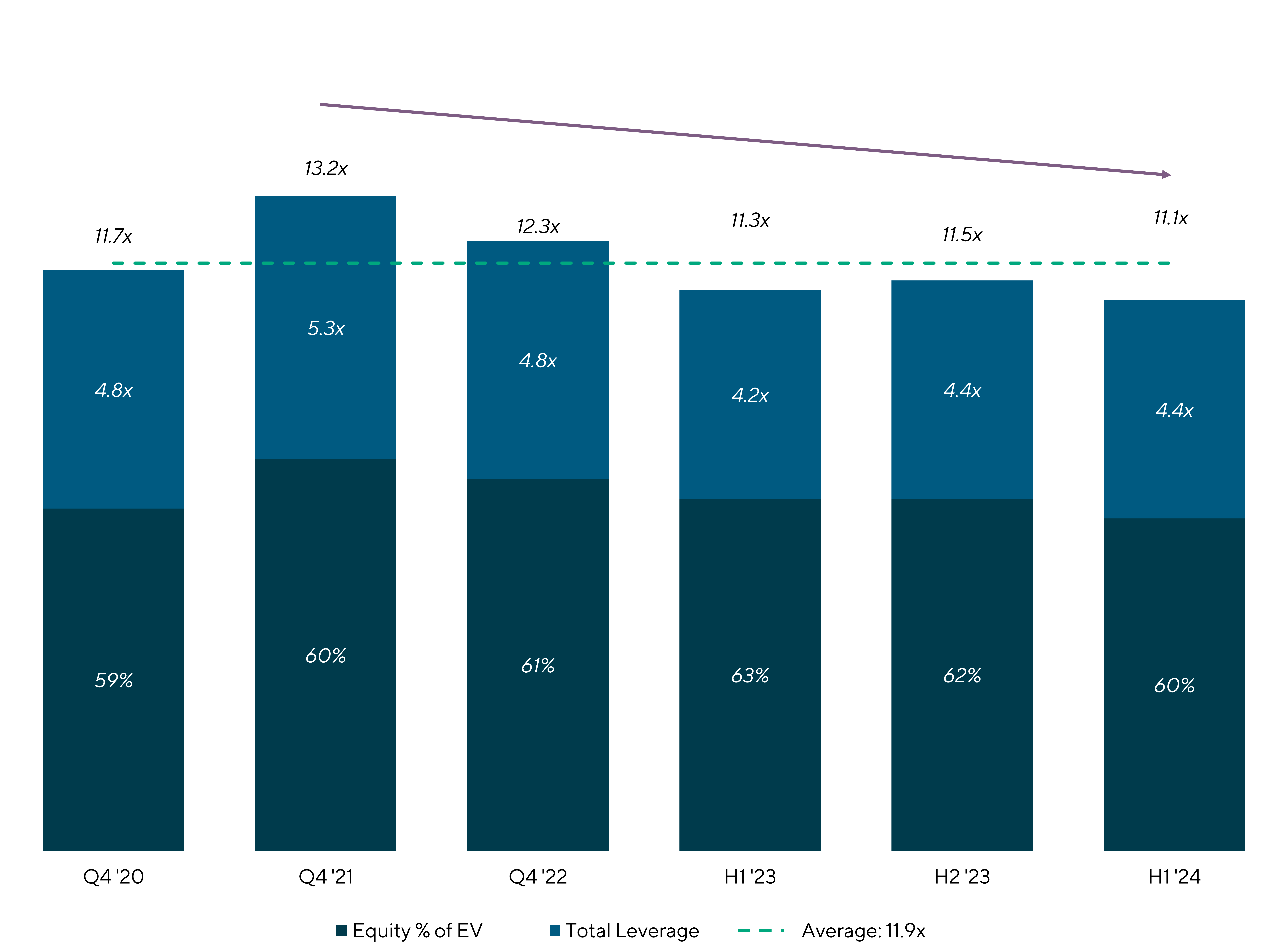 Transaction multiples declined ~2.1x through H1 2024 following Q4 2021 highs; leverage has also declined as underwritten equity cushion requirements remain elevated.