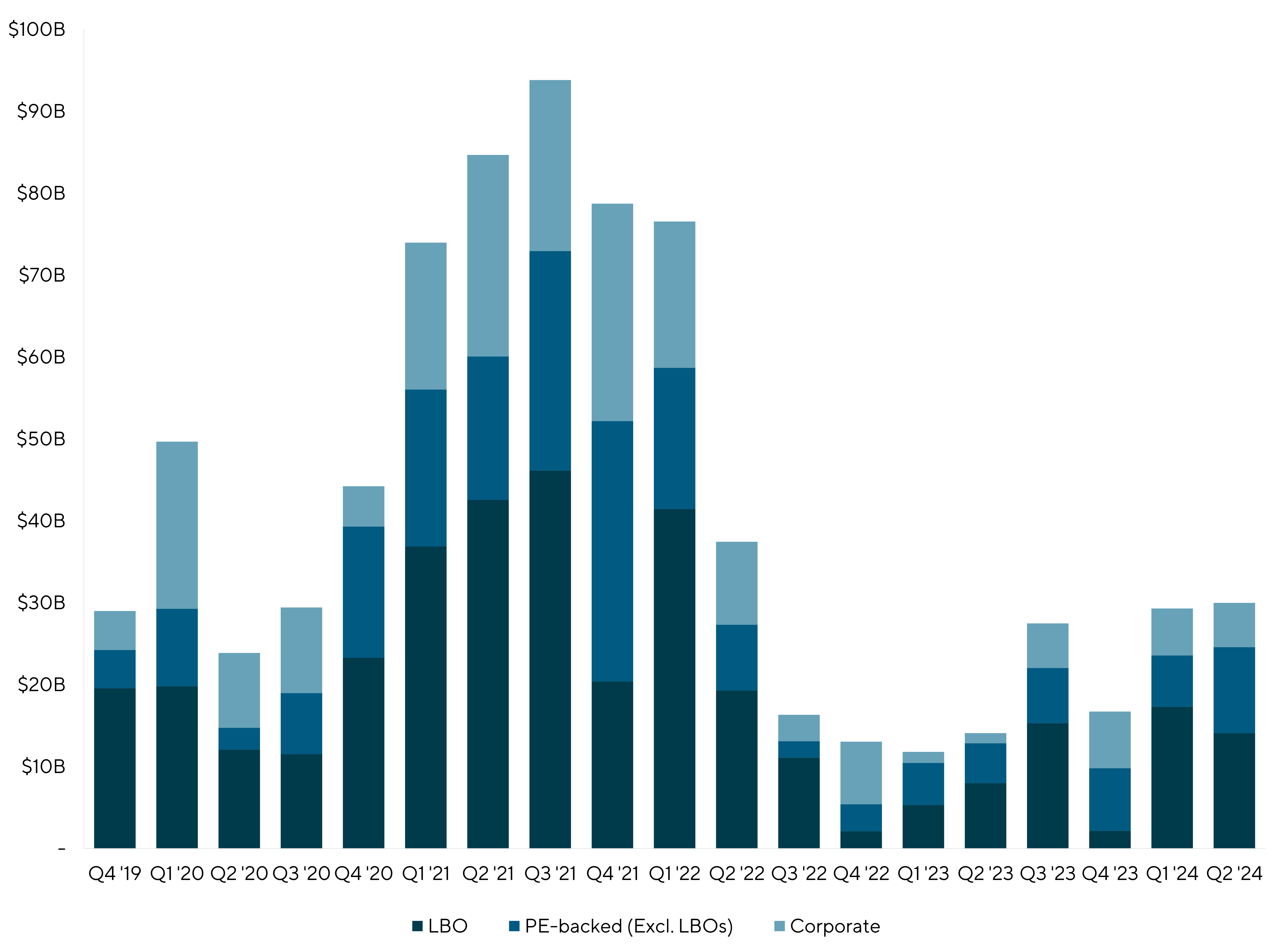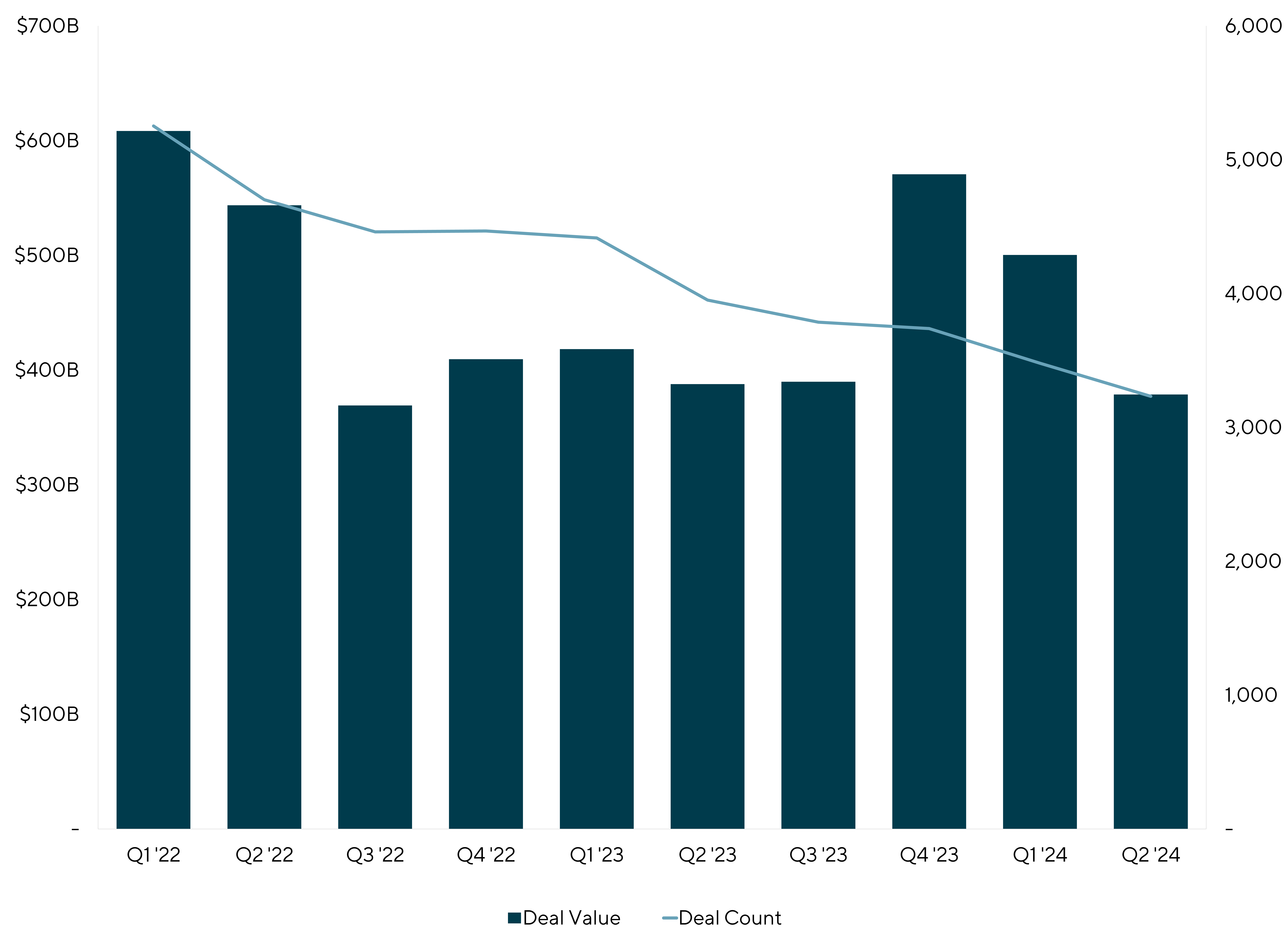 Valuation Recovery – Private company and public market valuations both increased in H1 2024; private company valuations, driven by strong operating performance, remained less volatile than the S&P 500, where increases were largely driven by multiple expansion within the seven largest companies.