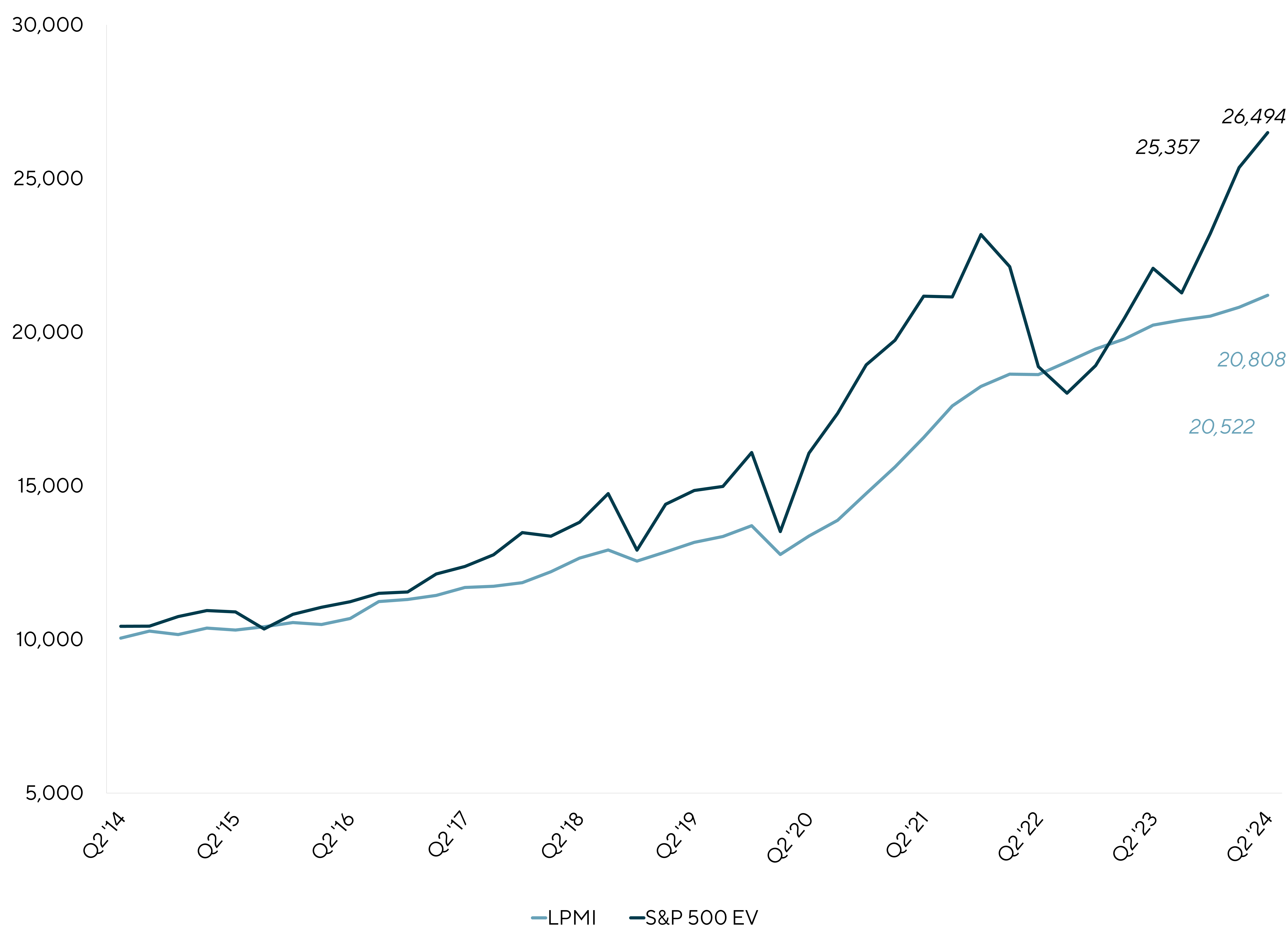 Note: (1) The Lincoln Private Market Index (“LPMI”) is a proprietary index based off of Lincoln International‘s Proprietary Valuations Database, which consists of 5,500+ US operating companies; (2) S&P 500 EV excludes financial companies for which enterprise value is generally not meaningful; including such companies produces qualitatively similar results; (3) Pitchbook LCD data; (4) Pitchbook data; (5) Avg Private Market figures reflect preliminary data