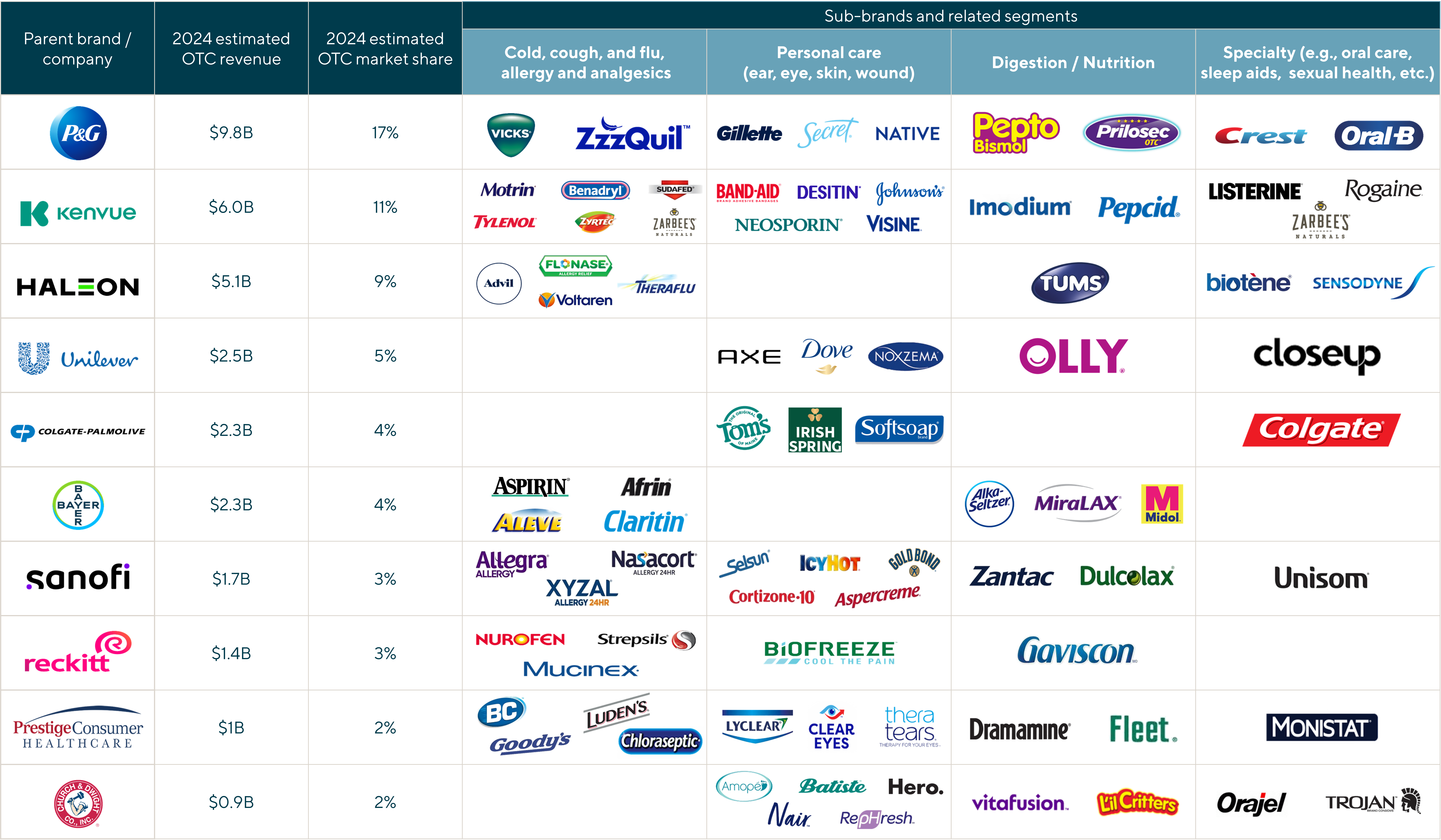 The OTC landscape is concentrated at the top, with players like Procter & Gamble, Kenvue, Haleon, Unilever and Bayer accounting for ~50% of the market. Each of these leaders manages a portfolio of brands spanning multiple sub-segments, from cold and allergy to oral care and digestive health, enabling scale efficiencies and shelf coverage across key consumer need states. At the same time, a long tail of emerging and independent brands continues to drive dynamism below the top tier.