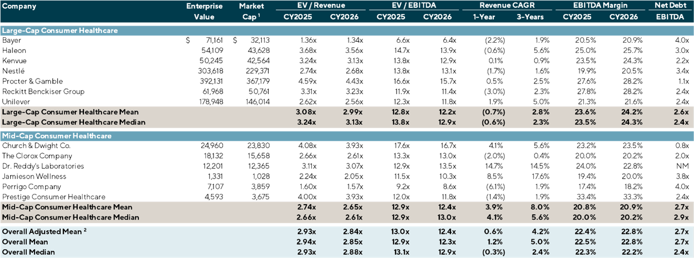 Consumer Health / OTC M&A Trends are Healthy with International Outperformance Demand for consumer health products is growing due to demographic changes, such as an aging global population and decreasing income levels. Cost-of-living factors, for example, are influencing consumer spending preferences, with more consumers (particularly in the U.S.) considering purchasing OTC medicine, vitamins, supplements and minerals as an alternative to costlier professional healthcare and prescription medicines. These positive market dynamics underscore outperformance of the broader consumer health market, supported by guidance from top publicly-traded consumer health platforms. Outlooks for key players include (per recent public guidance): Additionally, macroeconomic and regulatory headwinds are shaping the pace of consumer health OTC. U.S. drug pricing uncertainty, especially around executive orders focused on pricing and potential tariffs, has broadly cooled valuations in pharma, limiting speculative OTC deal activity. However, regulatory uncertainty also nudges investors towards more predictable consumer health assets—like OTC brands—versus risk heavy earlier-stage therapeutics. |