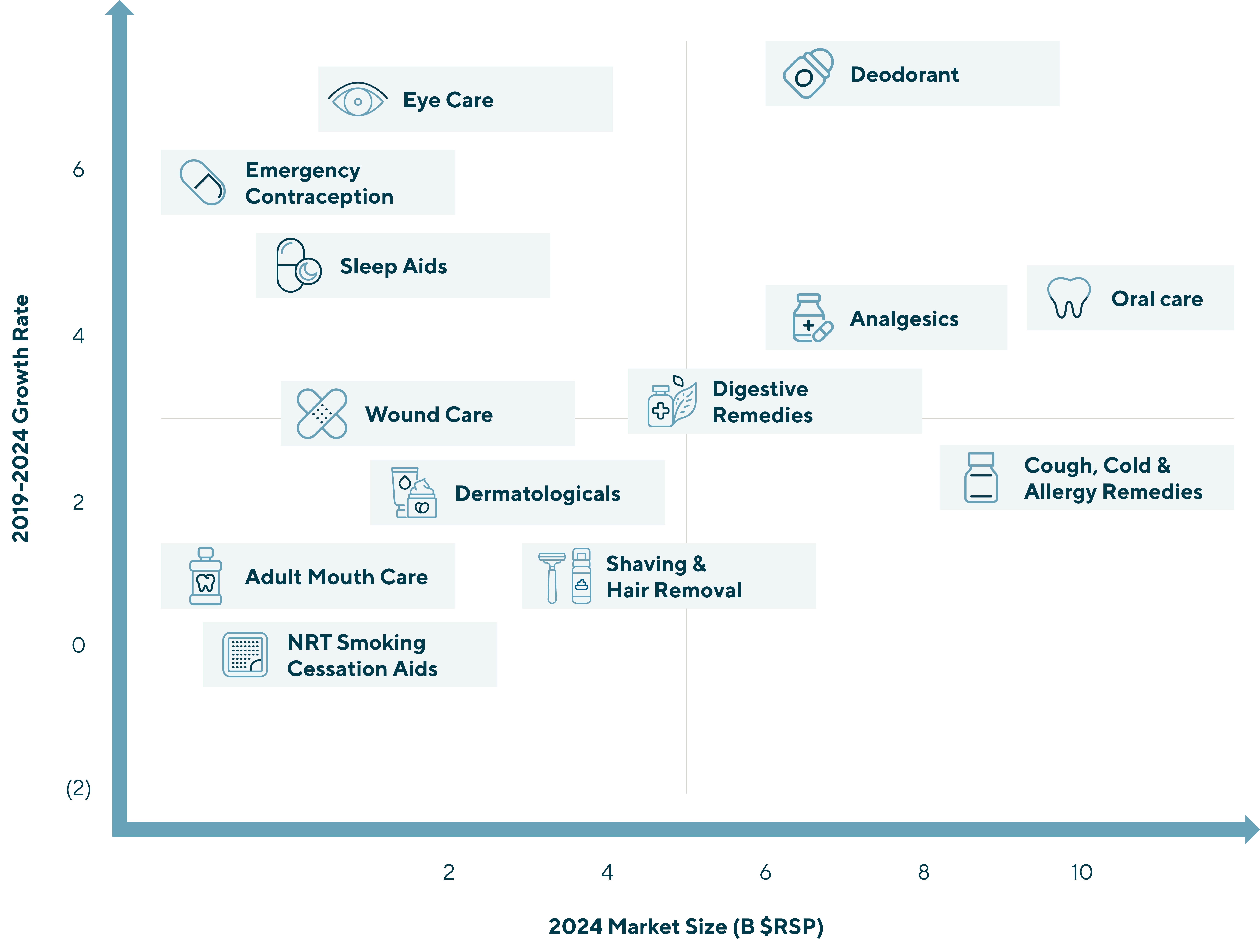 | Oral Care: As one of the largest OTC categories, oral care reached ~$11 billion in 2024 with a ~4% p.a. growth rate over the past five years. Growth is supported by increasing consumer preference for premium products offering whitening or enamel-strengthening benefits. |