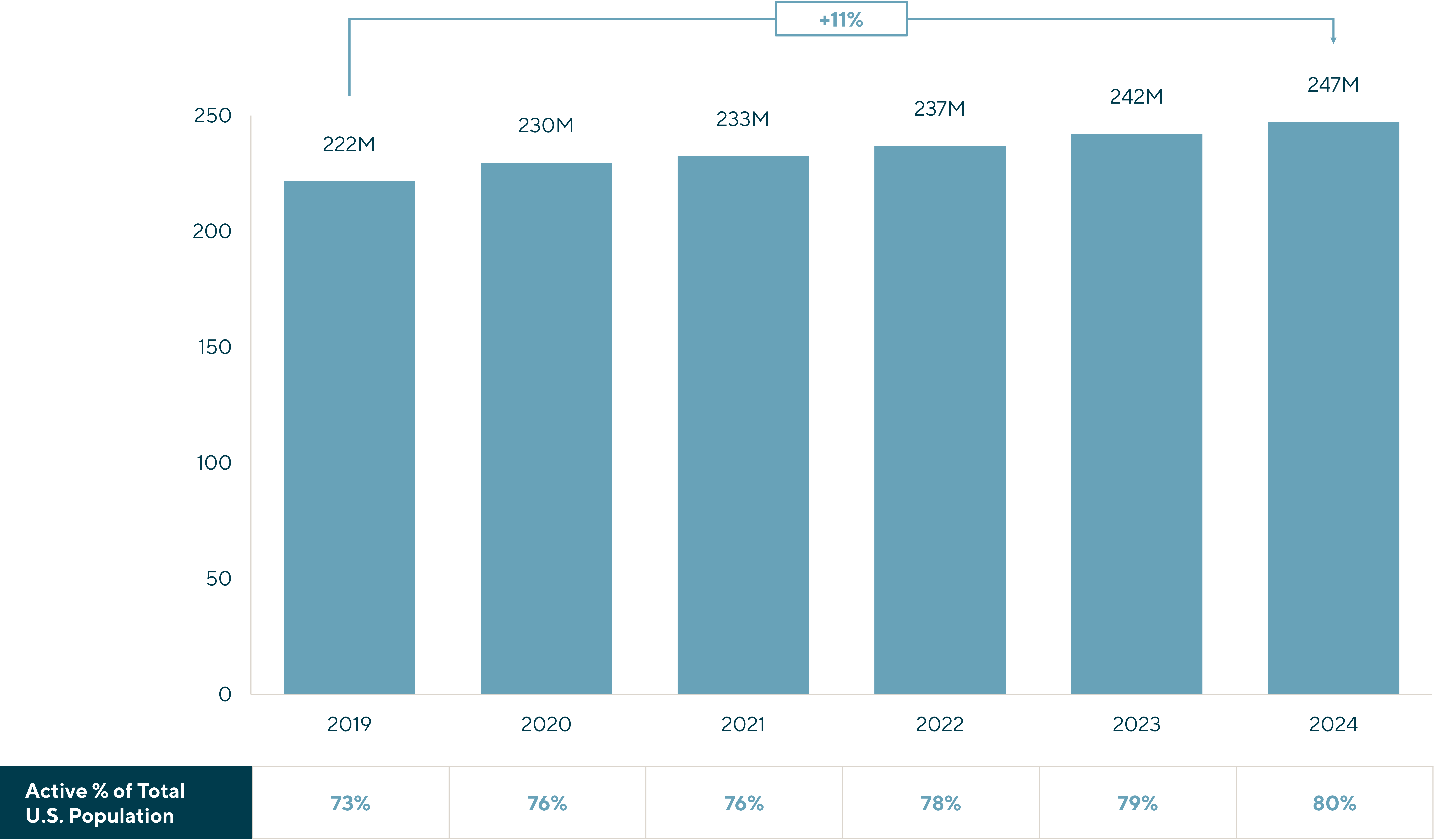 | A More Active Population Brings New Pain and Injury Management Needs: The share of physically active Americans rose from 73% in 2019 to 80% in 2024 (see Figure 3). Pickleball-related injuries alone increased 91% between 2020 and 2022. Notably, this increase in physical activity is especially pronounced among older adults. The American Academy of Orthopedic Surgeons projects a 123% increase in sports-related injuries among the 65+ population by 2040, reflecting their greater engagement in active lifestyles. OTC analgesics, wound care and joint support are benefiting the most from this shift. |
