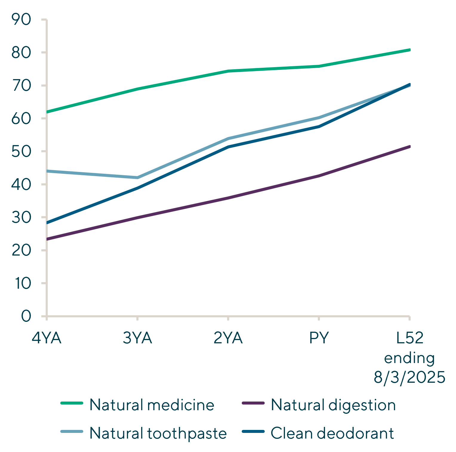 | The Shift Toward Natural Alternatives: Consumers increasingly demand chemical-free, recognizable ingredients. Google search trends show rising interest in terms like “natural medicine” and “clean deodorant” (see Figure 2). Brands are responding: Native highlights its four-ingredient formula (coconut oil, shea butter, probiotics, tapioca), while TheraBreath disrupted mouthwash by eliminating alcohol, dyes and sulfates. BoomBoom is disrupting the cold, cough and allergy market with nasal sticks that use clean, all-natural ingredients and proprietary nasal inhalation technology. |