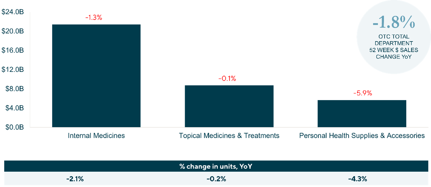 Largely flat YoY performance in the largest OTC categories, internal medicines and topical medicines & treatments