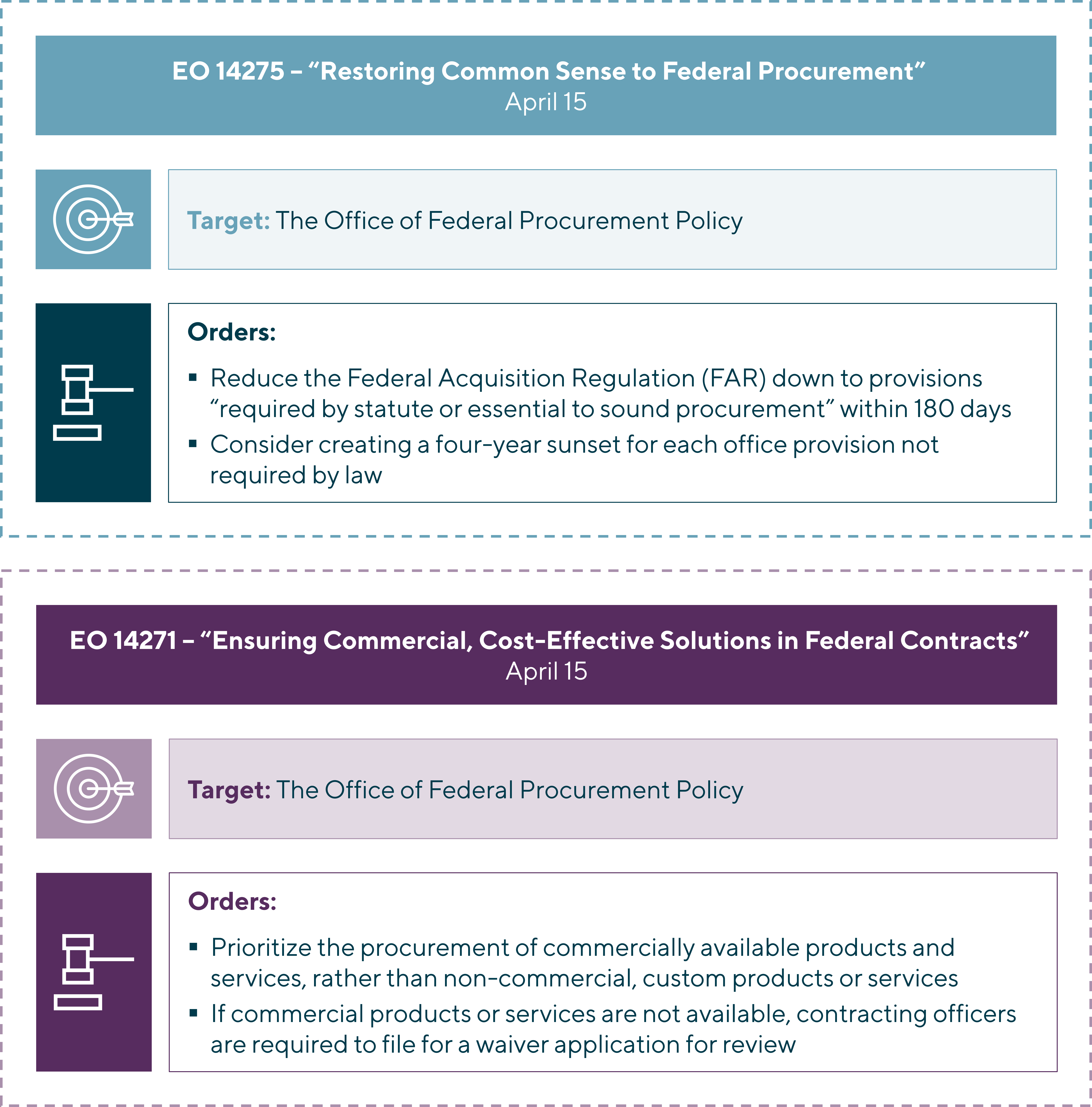 On April 10, Defense Secretary Pete Hegseth issued a memo terminating four IT services contracts worth $5.1 billion, about 0.61% of the current defense budget. The move comes as the department aims to shrink its civilian workforce by roughly 60,000 jobs. Less than a week later, the White House issued two executive orders (EOs) designed to “create the most agile, effective, and efficient procurement system possible” simplifying the annual government procurement of nearly $1 trillion of goods and services. Most recently, in late April, Secretary Hegseth directed the U.S. Army to implement a comprehensive transformation strategy that seeks to, in part, eliminate redundancies and waste, reform the acquisition process and modernize inefficient defense contracts.