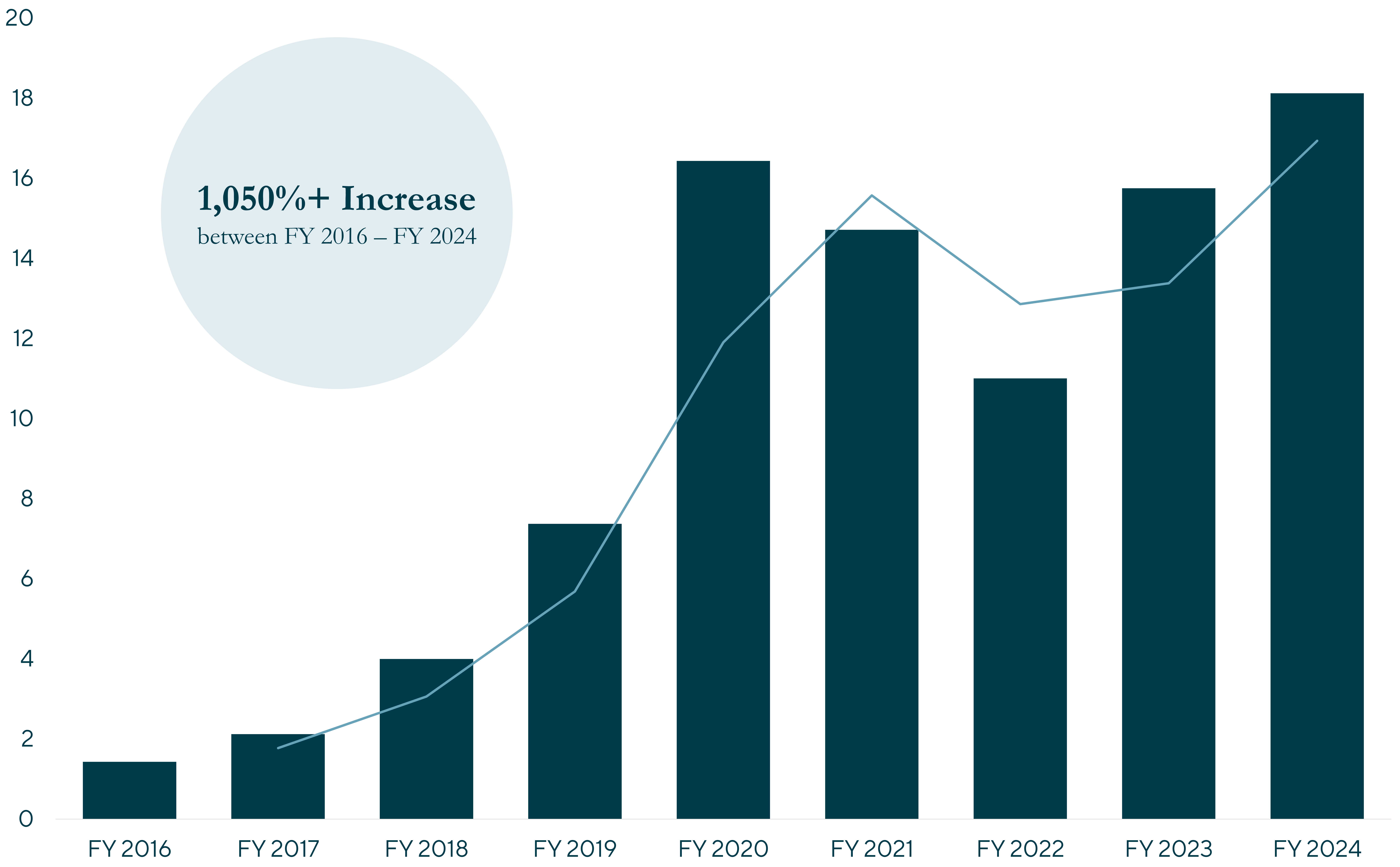 At the heart of this pivot is the Department of Defense’s (DoD) evolving appetite for speed and innovation. Other Transaction Authorities (OTAs) and Commercial Solutions Openings (CSOs), once considered niche procurement methods, have become mainstream procurement tools. Between FY2021 and FY2024, the DoD obligated nearly $63 billion through OTAs, up from just $760 million a decade ago. OTAs were designed to move faster than traditional contracts and bypass the lumbering requirements of the Federal Acquisition Regulation (FAR). The growth at which OTAs are being leveraged underscores how serious the government is about buying new technology quickly and efficiently.