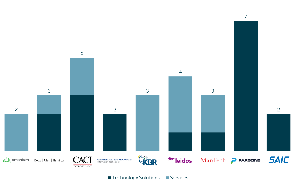 Parsons has led the market with seven tech deals completed, building a portfolio around cyber, electronic warfare and C4ISR [2] by acquiring firms such as BlackHorse Solutions, BlackSignal Technologies and Sealing Technologies. Elsewhere, CACI added SA Photonics to deepen its communications and space optics capabilities. More recently, GDIT purchased Iron EagleX for its AI / machine learning, cyber and quantum computing technologies.