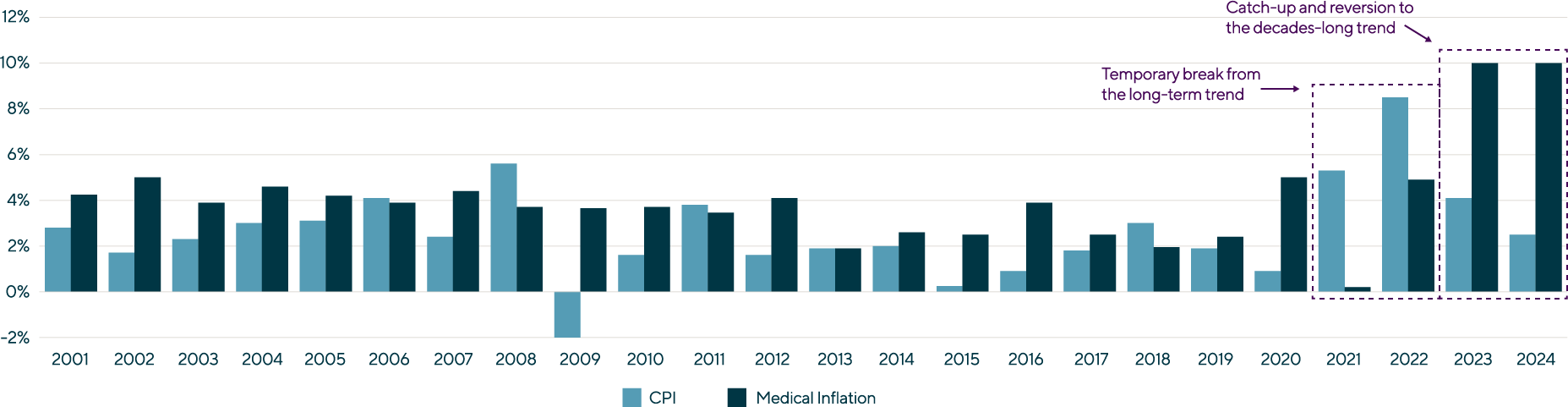 Annual CPI and Medical Inflation: 2001 – 2024 (projected)(1) |