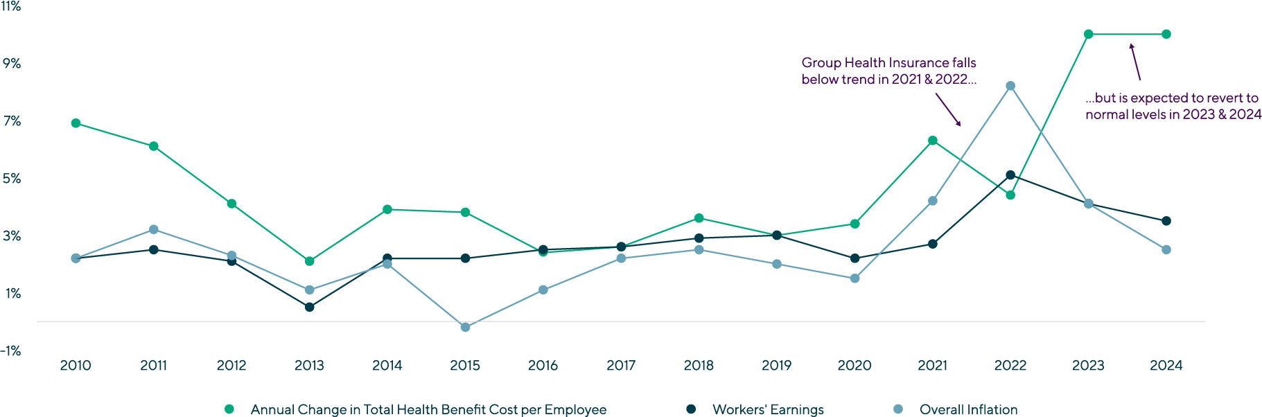 The cost for employers to provide quality medical coverage to employees and dependents has become an ever-growing share of overall compensation as GHI price increases have consistently grown above wage increases. This trend temporarily reverted in 2021 and 2022 – for reasons discussed above – and will revert back to the norm in 2023 and beyond. Left unaddressed, GHI will represent an ever-growing share of an employee’s total compensation.