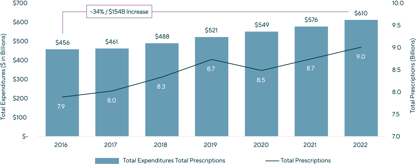Prescription Drug Expenditures and Prescriptions, 2016 – 2022(3,4) |
