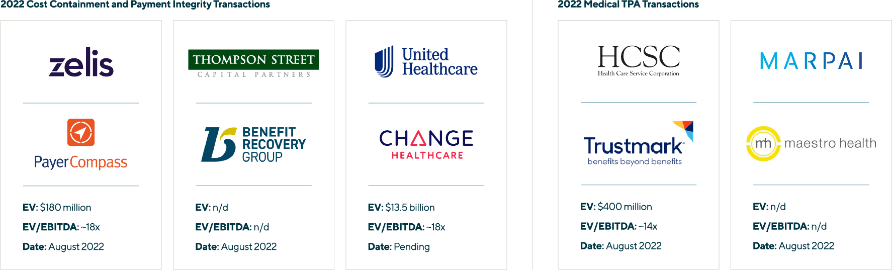 Near-term and longer-term industry dynamics will continue to drive the self-insured employer ecosystem of medical TPAs and cost containment businesses as employers seek innovative, sustainable solutions with tangible ROIs. The result will be continued high demand from both the private equity and strategic buyer universe.