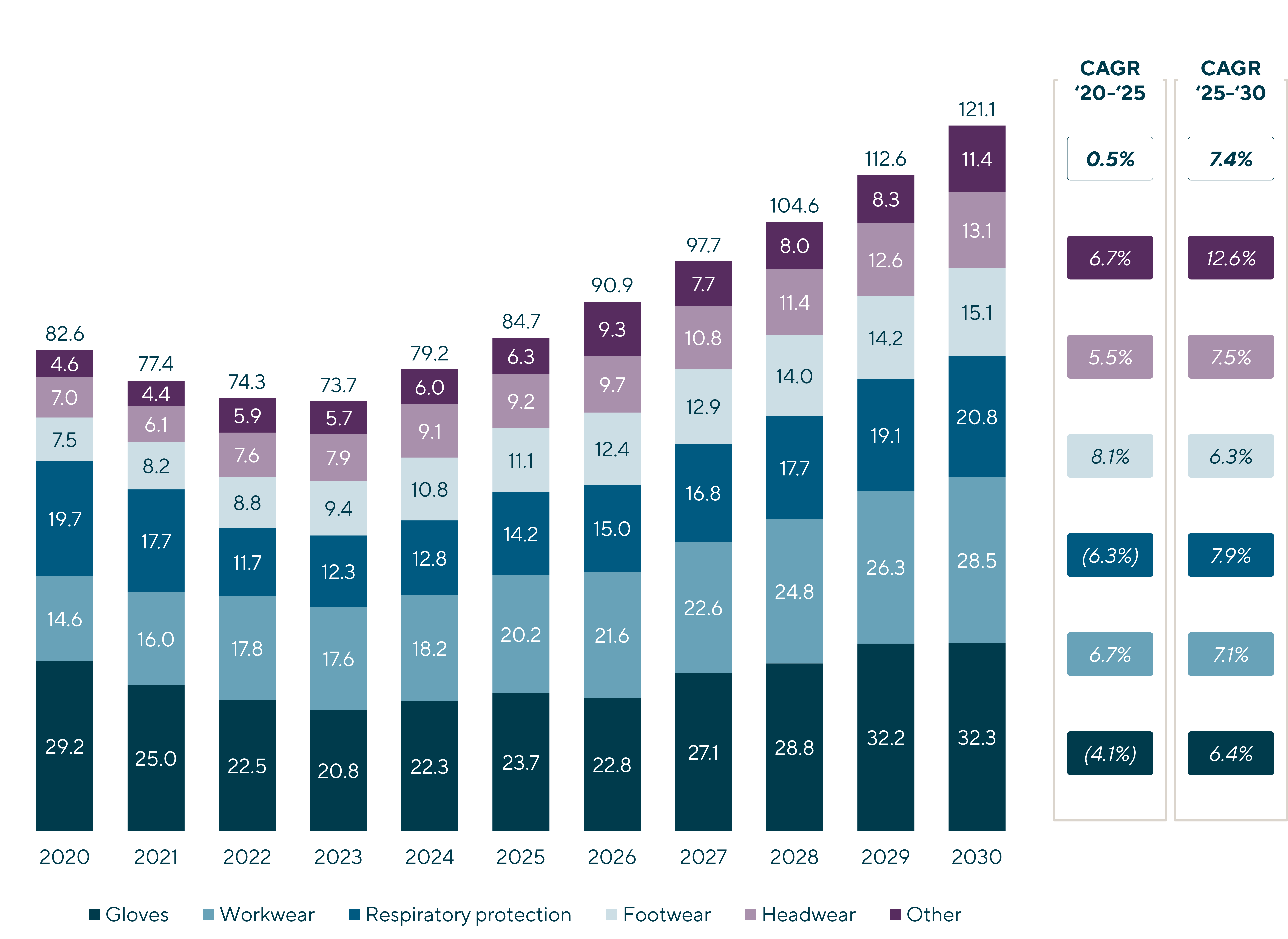 The global PPE market in 2025 is valued at an estimated €84.7 billion, with the largest product segments being hand protection (€23.7 billion) and clothing (€20.2 billion). Despite the sharp decrease in pandemic-related demand, the PPE sector is projected to grow at a 7.4% CAGR between 2025 and 2030, reaching €121.1 billion in market size. This growth is being fueled by the “premiumization and brandization” of PPE products, as well as technology advances and tightening health and safety regulations.