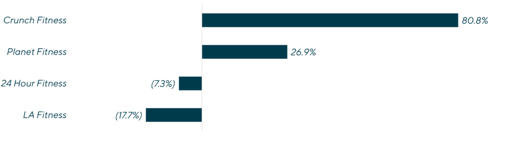 Though a rising tide has lifted all boats, High-Value Low-Price (HVLP) gyms (e.g., Planet Fitness, Crunch Fitness) and Premium gyms (e.g., Life Time, Equinox) have outpaced the broader market and continued to capture share from the mid-market segment, albeit for different reasons.