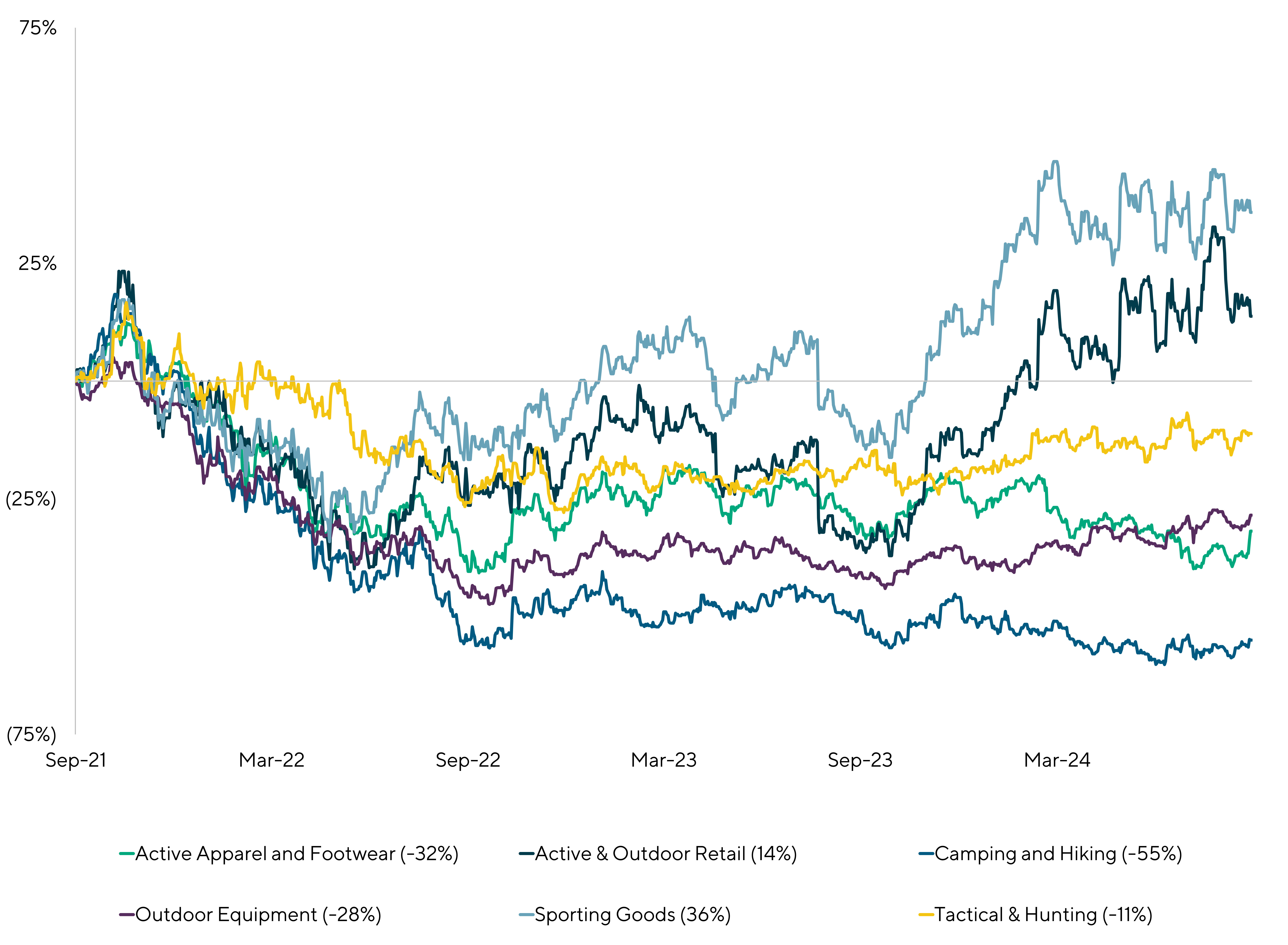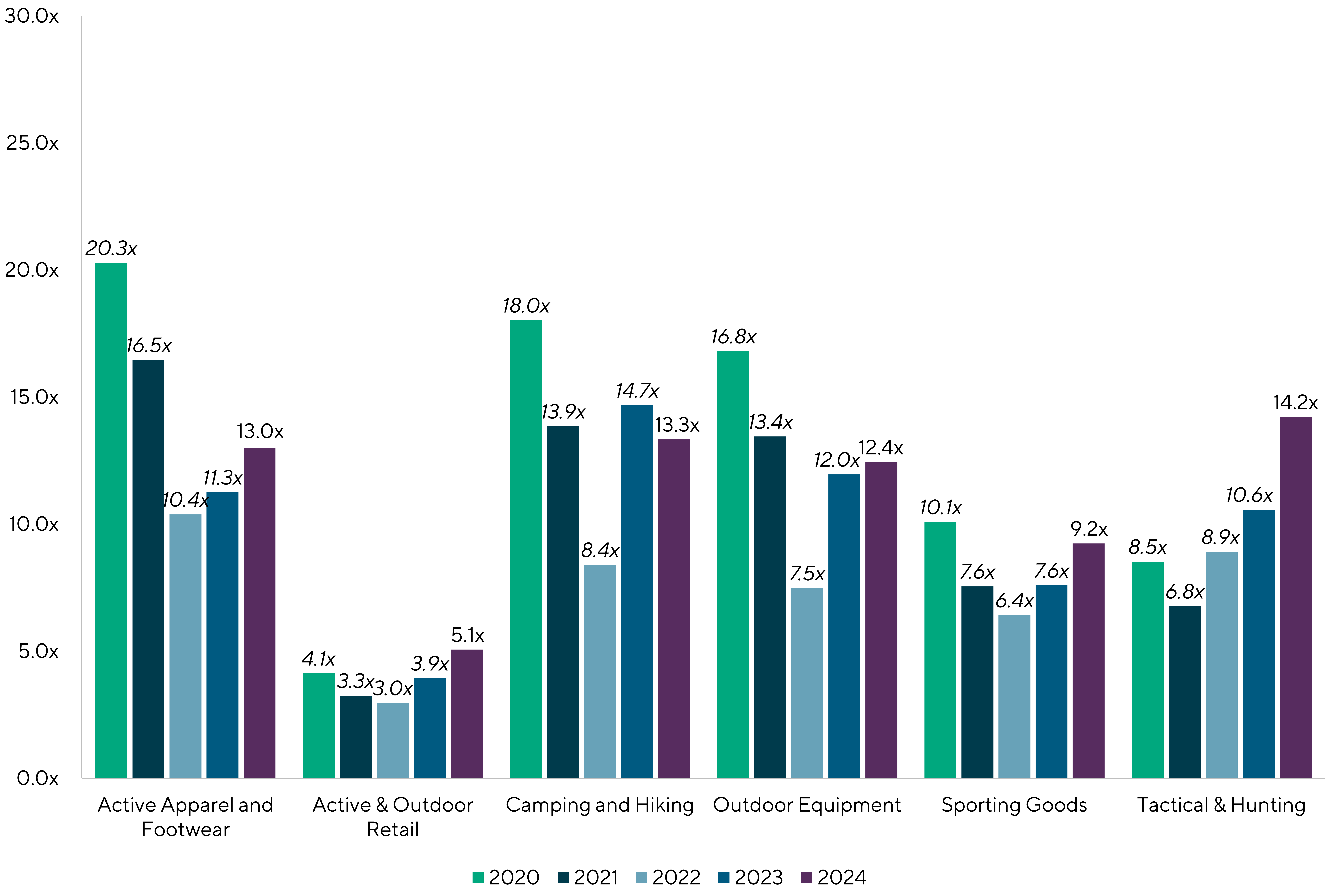 The public markets across all six active outdoor and sports subsectors have improved significantly since 2022, with the overall market improving from 8.3x EV / LTM EBITDA to 12.0x EV / LTM EBITDA. Overall, the improvement in public market valuations from the lows of 2022 signals a more favorable environment for both companies and investors, fostering greater activity and opportunities in the financial markets.