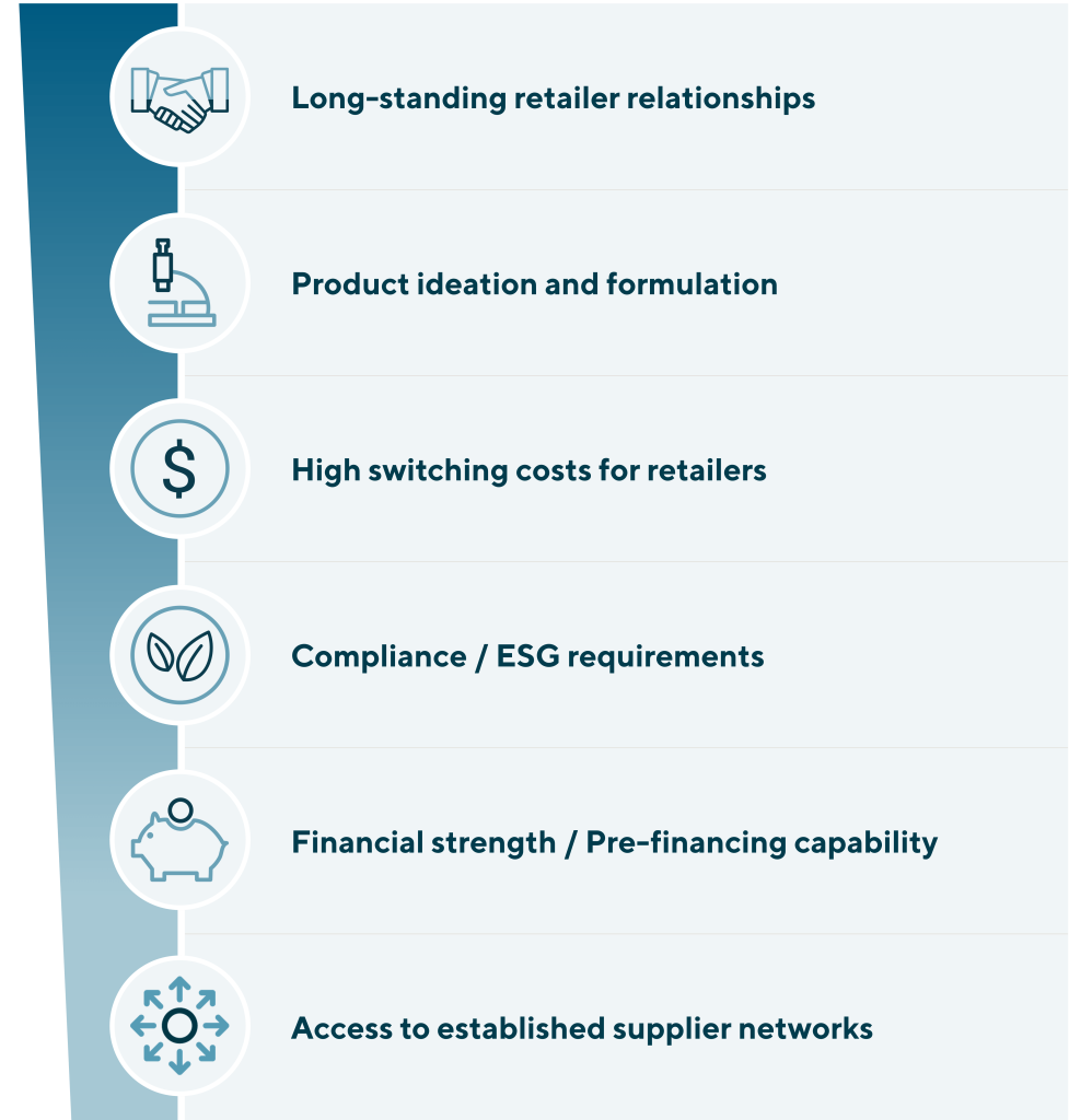 While the private label market continues to grow and offer unique business opportunities for services and product players in the different categories, high structural entry barriers offer financial and strategic investors an attractive opportunity to invest. The relevant entry barriers are driven by retailer relationships, switching costs and compliance needs.