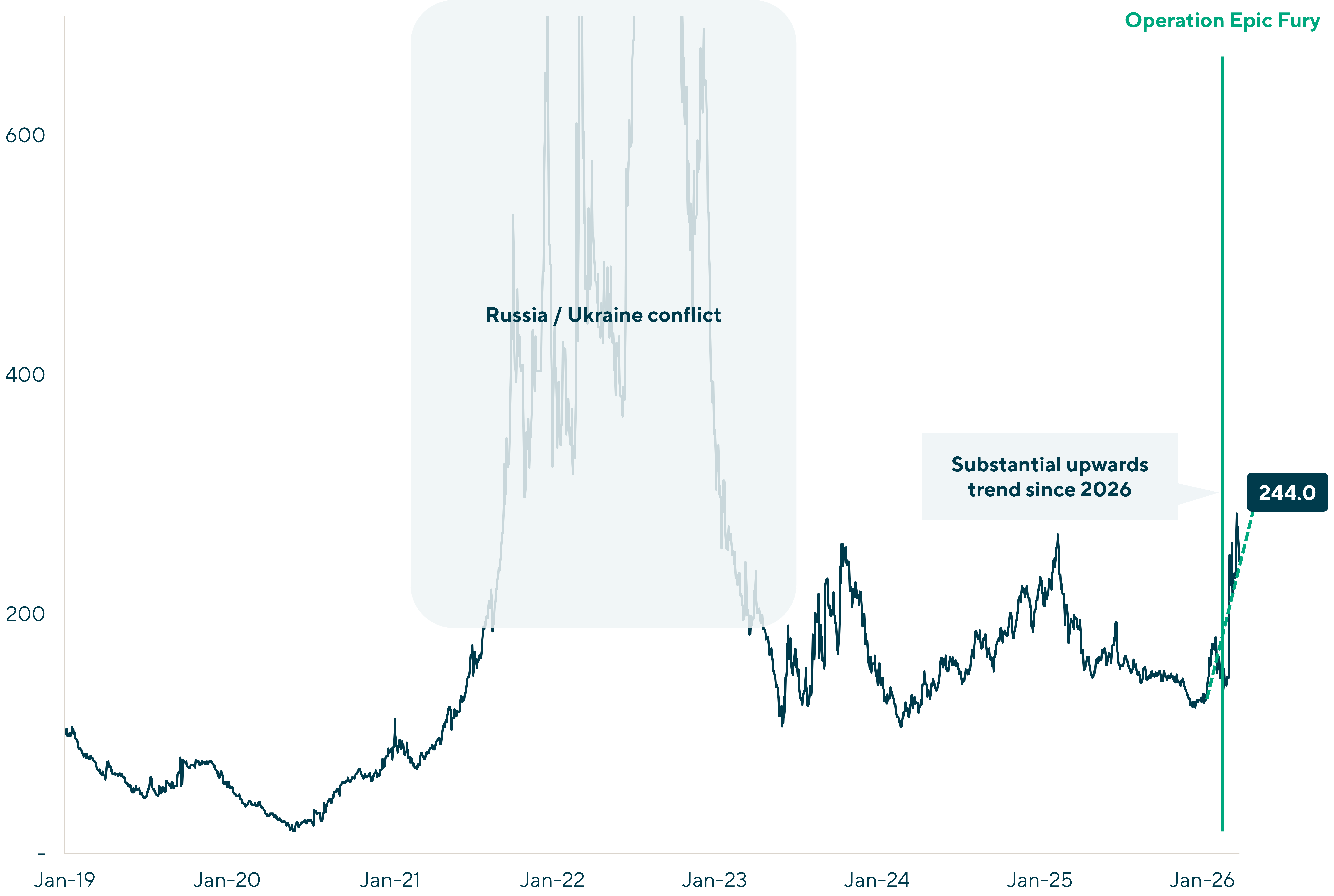 Development of EU Natural Gas Prices (Indexed to January 1, 2019) Source: S&P Capital IQ as of 25th March 2026 |