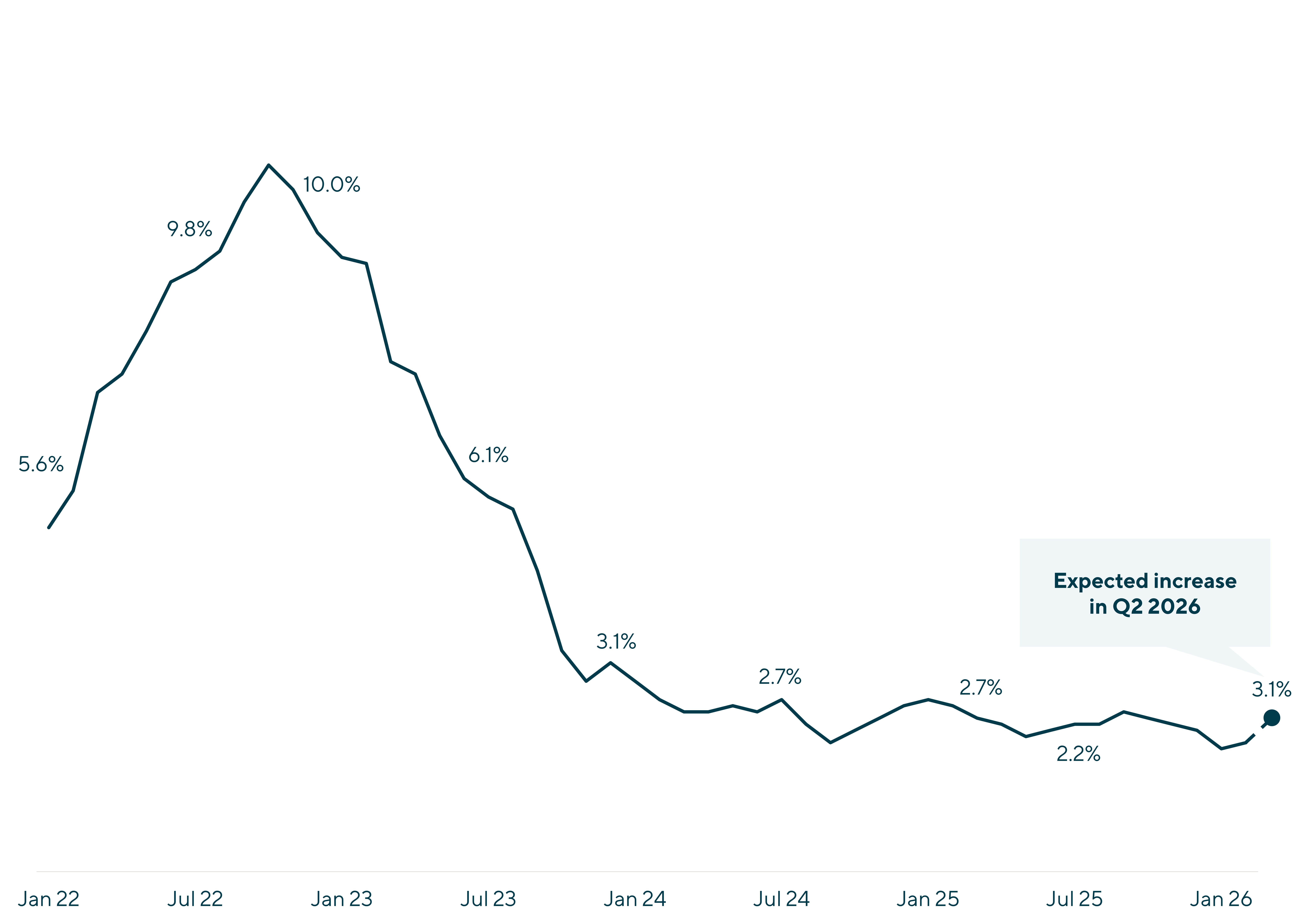 As highlighted in the following chart, consumer inflation has subsided from its peak in 2022 but is expected to increase as energy cost rises impact the price of goods and services more broadly.