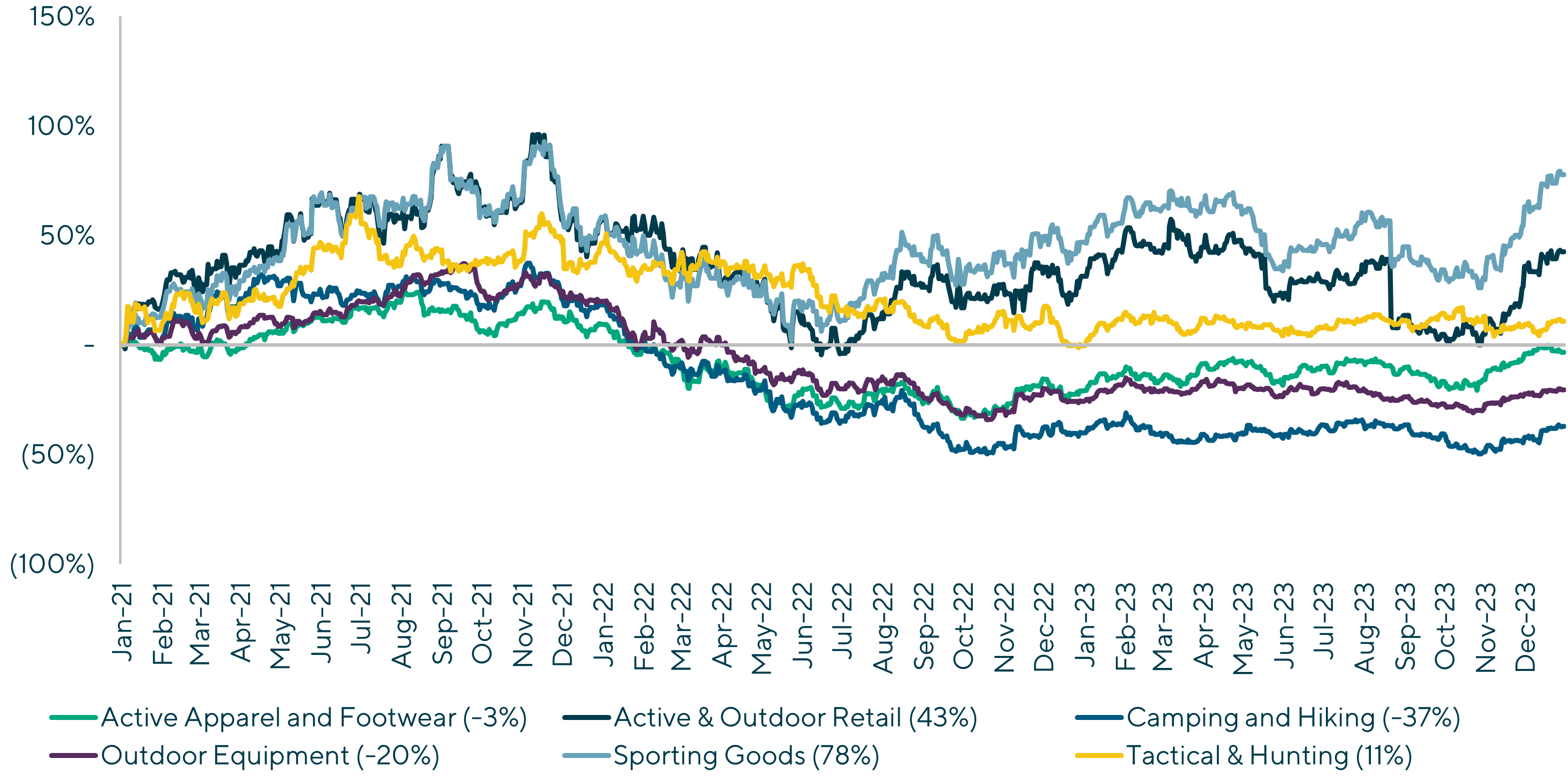As the supply chain recovered and consumer demand preferences began to evolve, the market had to manage through elevated inventory levels in 2023, leading to significant discounting from brick-and-mortar and e-commerce retailers, or inventory being pushed back onto brands. In response, many companies tried to double down on finding ways to grow their e-commerce presence to avoid potential inventory challenges with retailers. Despite strategic initiatives to reduce the impact, many outdoor brands and retailers, including Columbia Sportswear, Nike, Solo Brands, Revelyst, VF (North Face) and REI are now experiencing significant revenue declines and cost cutting measures as they react to these market difficulties.