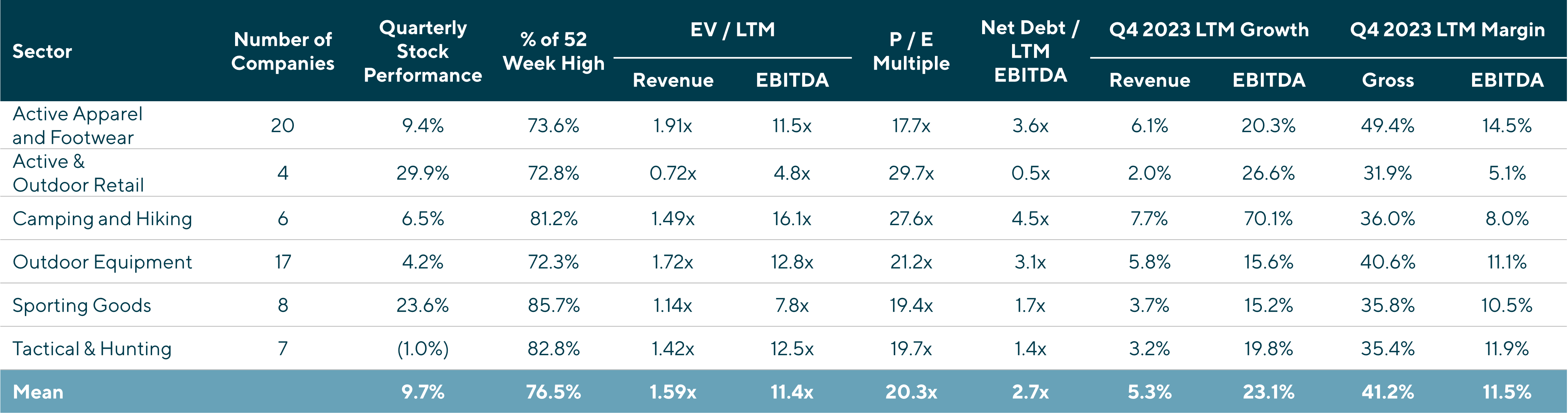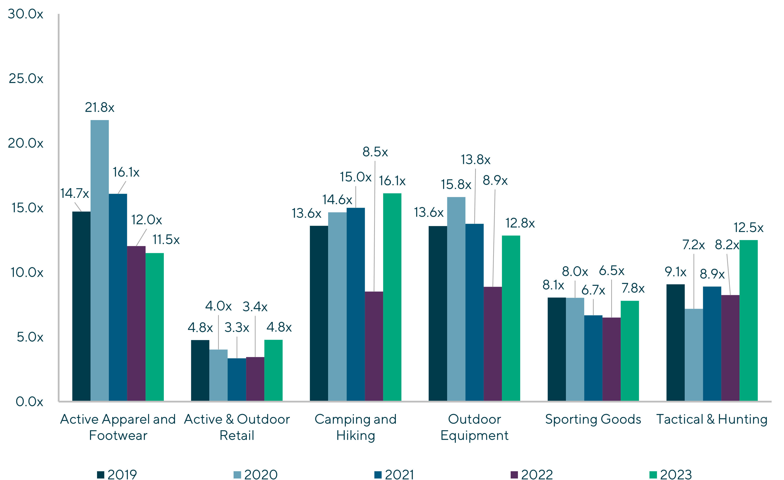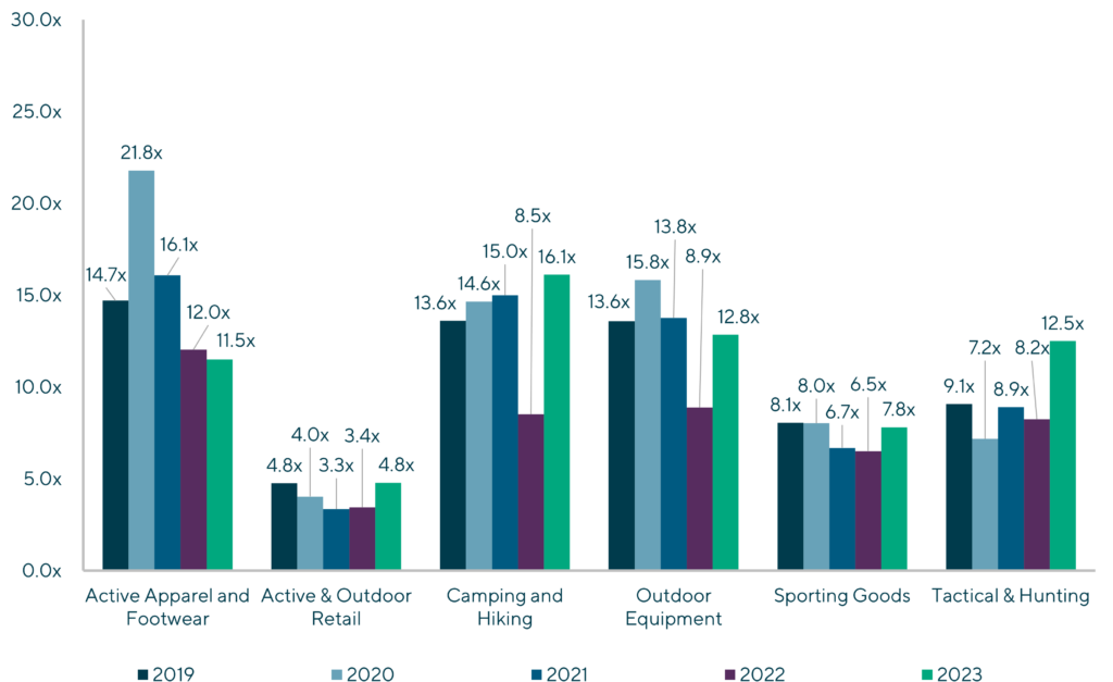 Given these dynamics, most companies are sitting on the sidelines and waiting for either improved company financial performance or financial investor interest in the category to pick back up. In the interim, active outdoor M&A processes with strategic or strategic financial buyer outcomes will continue to be over-indexed to historical averages (such as Yeti’s acquisition of Mystery Ranch). As company financials continue to improve and the challenges related to the inventory glut of 2023 move farther in the rear-view mirror, the expectation is that buyer and seller valuation expectations will become closer aligned and investor interest in the category will follow the heels of the long-term consumer participation rate in the industry.