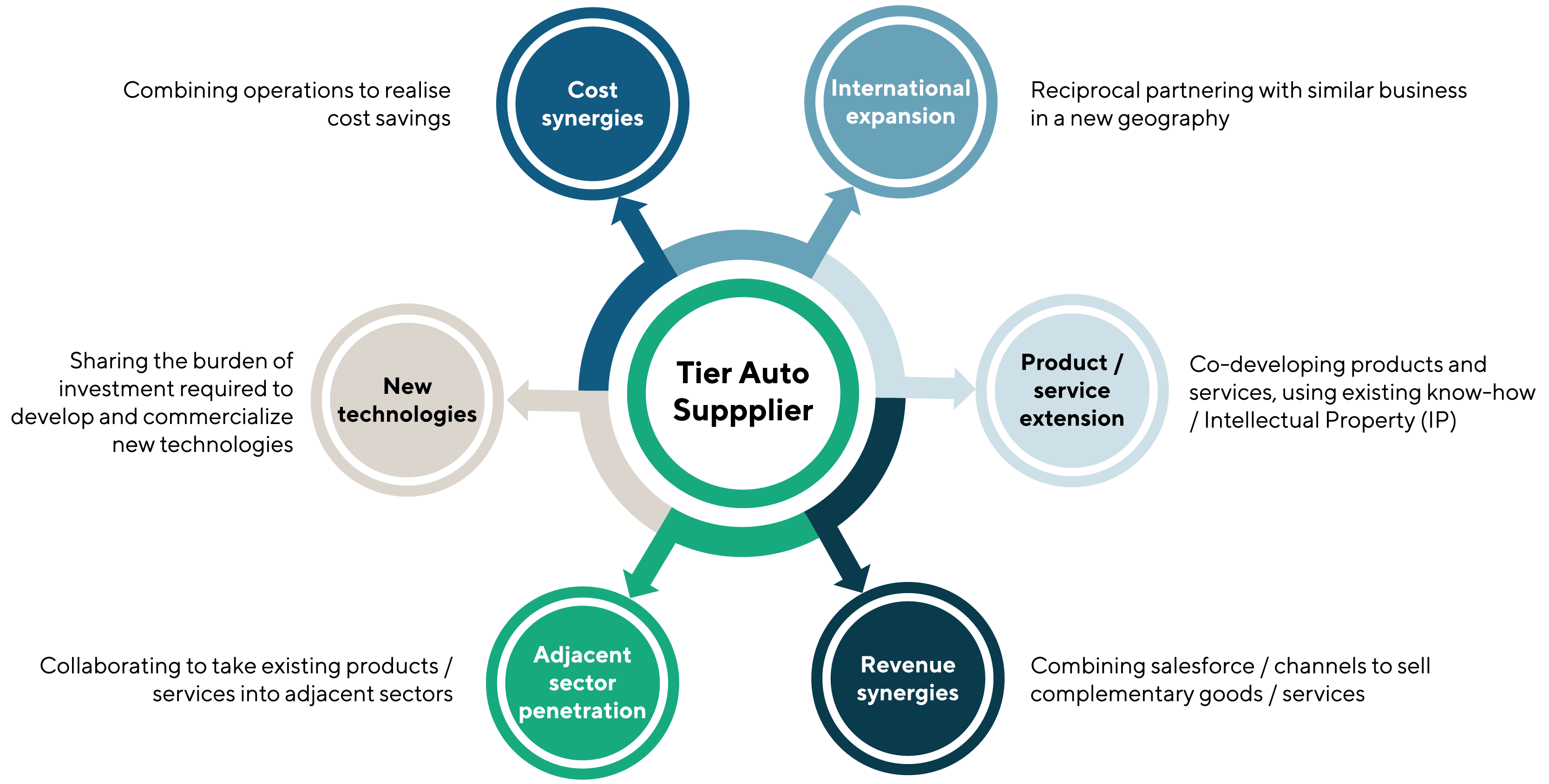 The impact of such deals is rippling down into the middle market. Our team believes that there is ripe opportunity for Tier 1 suppliers to partner too—with tech companies, with their own competitors or with businesses in adjacent sectors—to accelerate their growth trajectory.