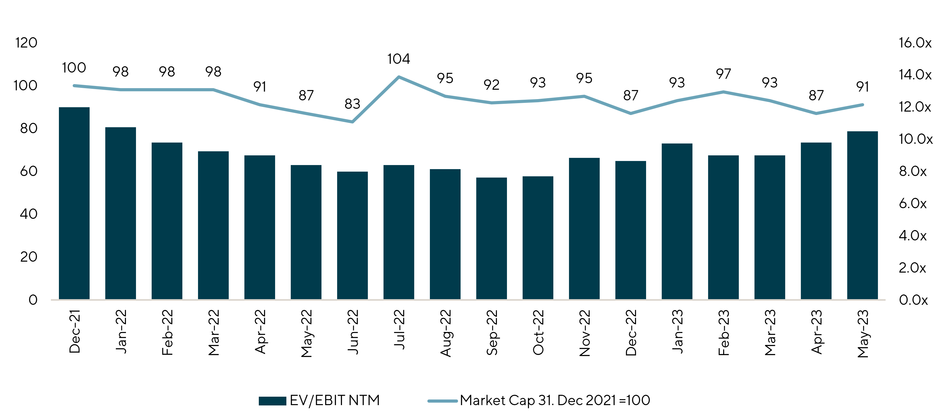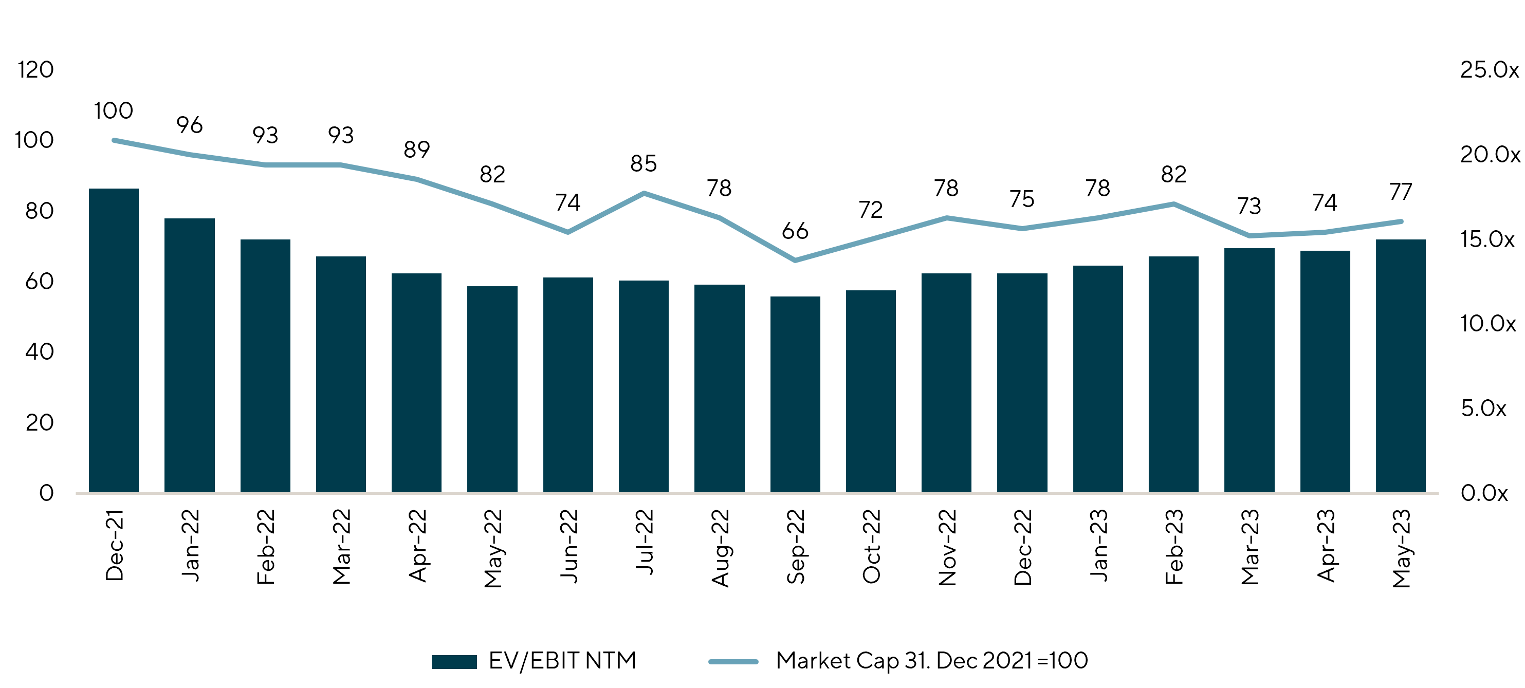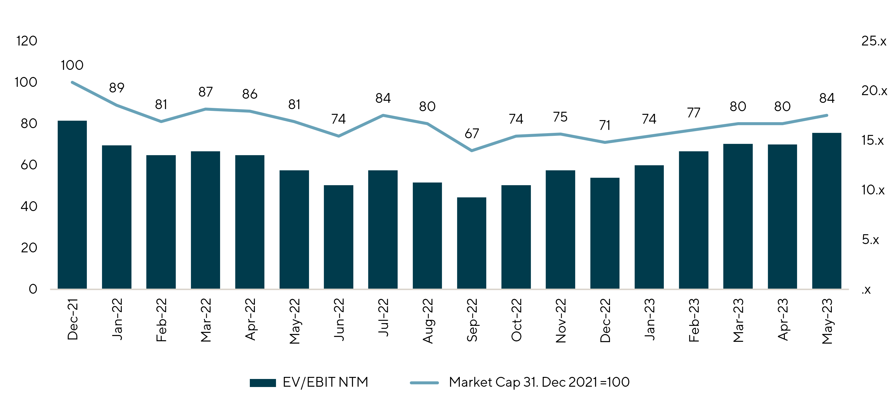 Normalization of freight rates should support dealmaking by reducing uncertainty over the “right level” of earnings for a deal valuation between sellers and buyers. In addition, overall market sentiment seems to have improved significantly versus the lows seen during the second half of last year. This applies in particular to the forwarding segment, where average peer group market capitalization was down by 33% in September (vs. Dec. 2021), but has increased by +25% on average since then. Implied valuation multiples have also recovered and stabilized, further supporting the dealmaking environment as buyers typically cross-check purchase prices against listed peer group valuation multiples.