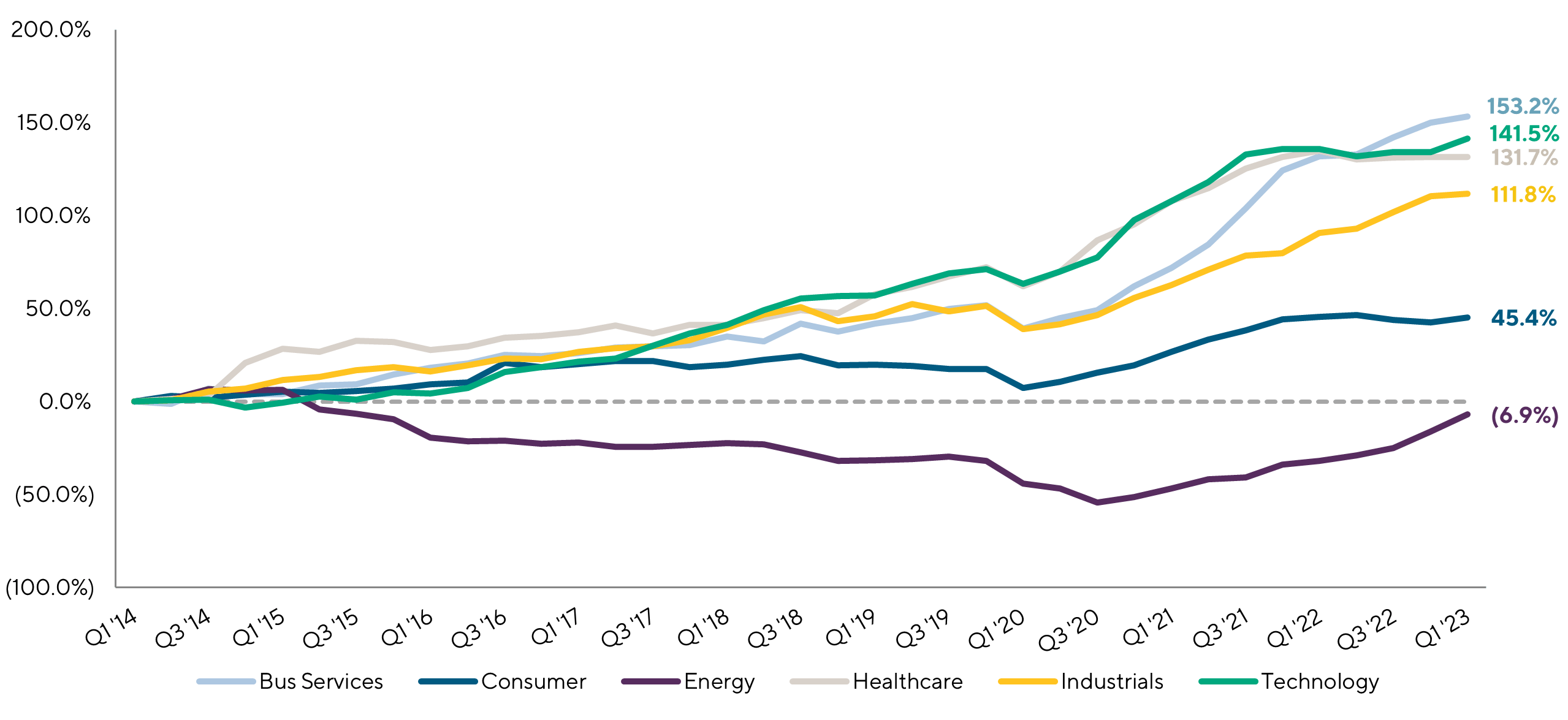 - Healthcare, a former safe haven, was the only industry to see flat enterprise value in Q1 2023 as healthcare companies continued to face greater labor pressures and difficulties in increasing pricing.