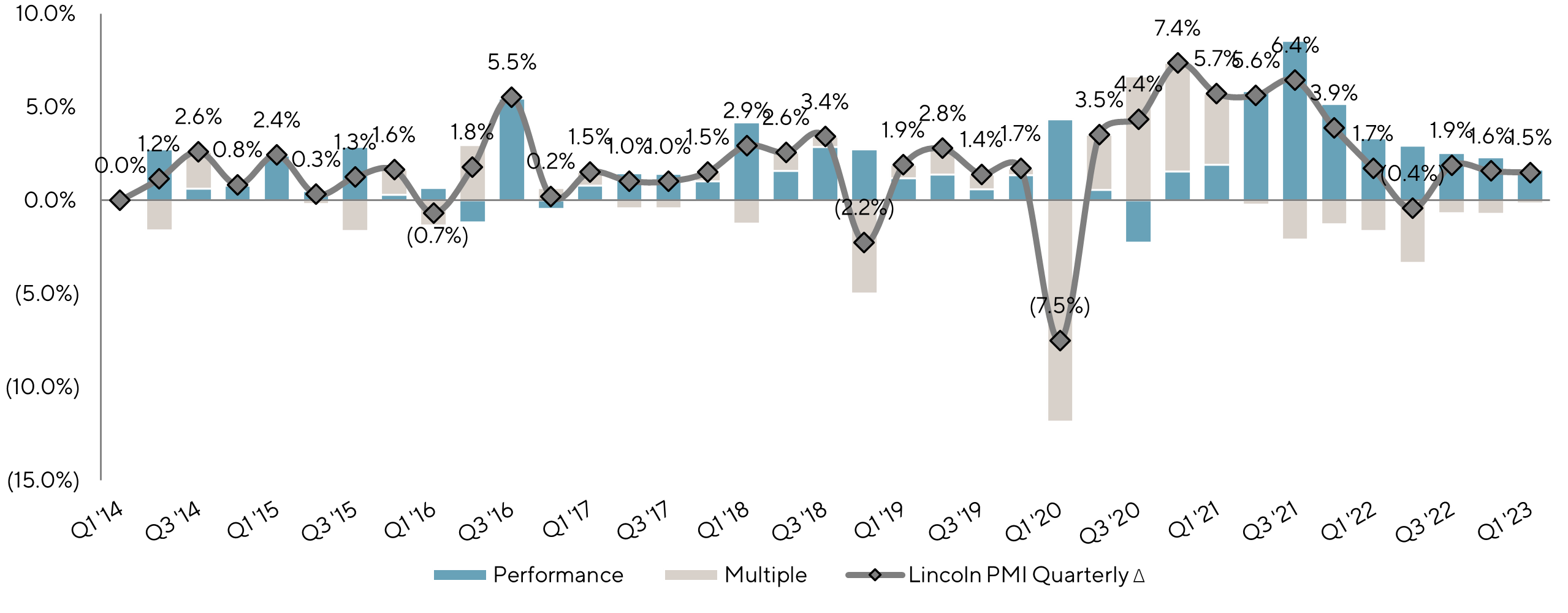 - In Q1 2023, both the Lincoln PMI and S&P 500 EV indices increased, although for different reasons. The Lincoln PMI benefitted from improved operating results, whereas the S&P 500 index benefitted from multiple expansion.