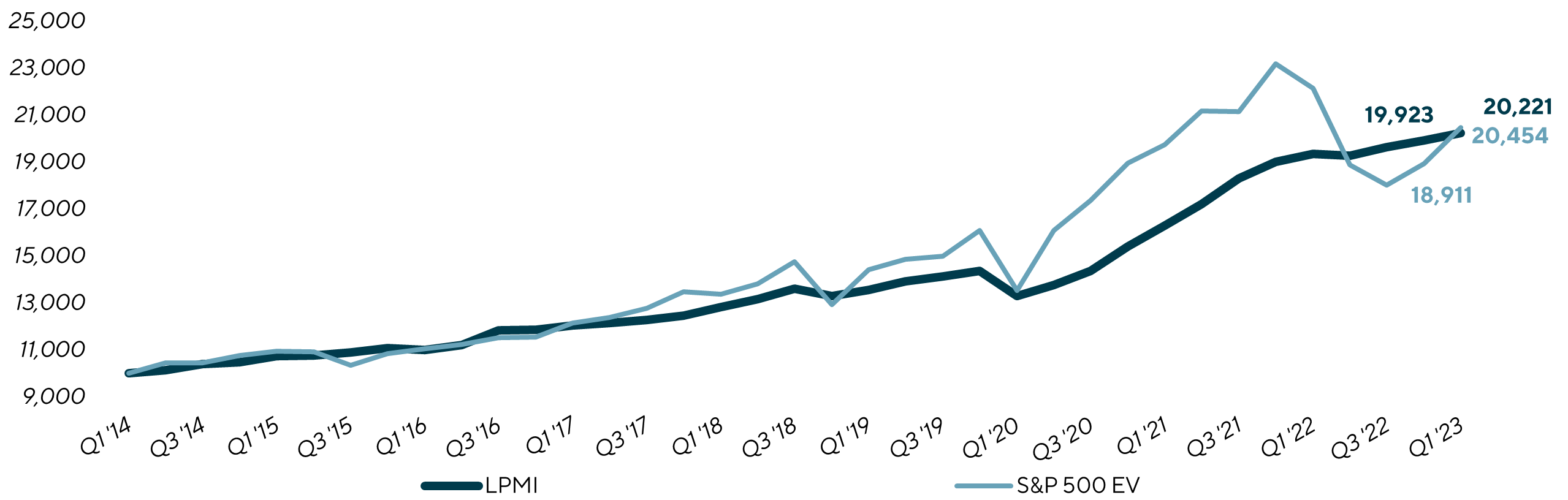 - Despite similar directional growth in 2021, the Lincoln PMI and S&P 500 EV experienced diverging performance in early 2022 before reconverging in Q1 2023. The differences were a result of more volatile multiples seen throughout 2022 in the S&P 500 EV relative to the Lincoln PMI.