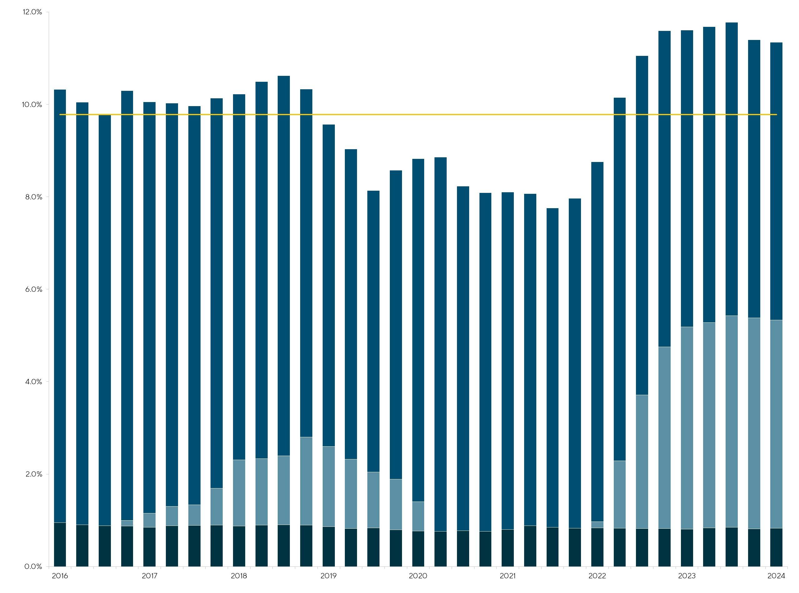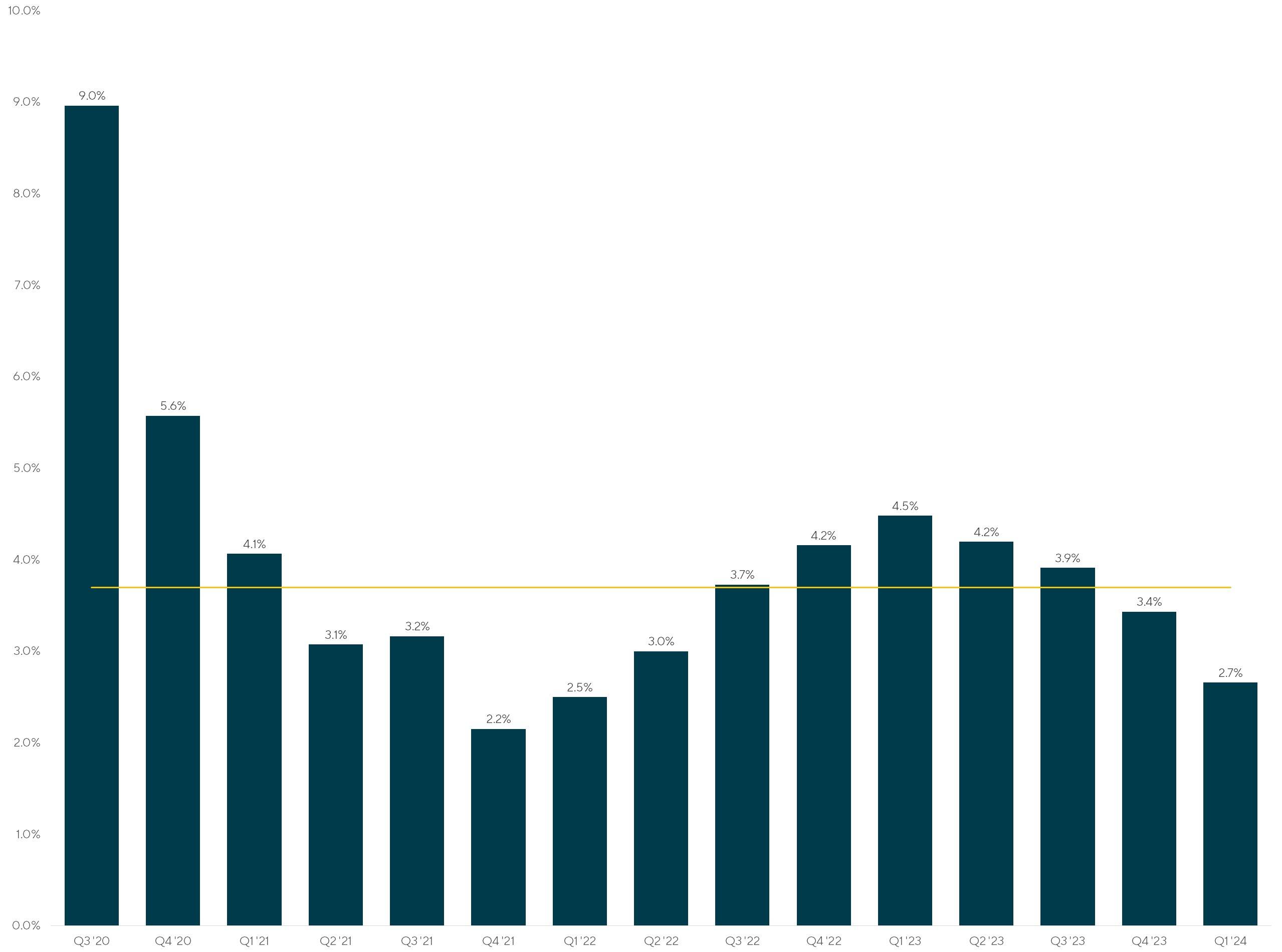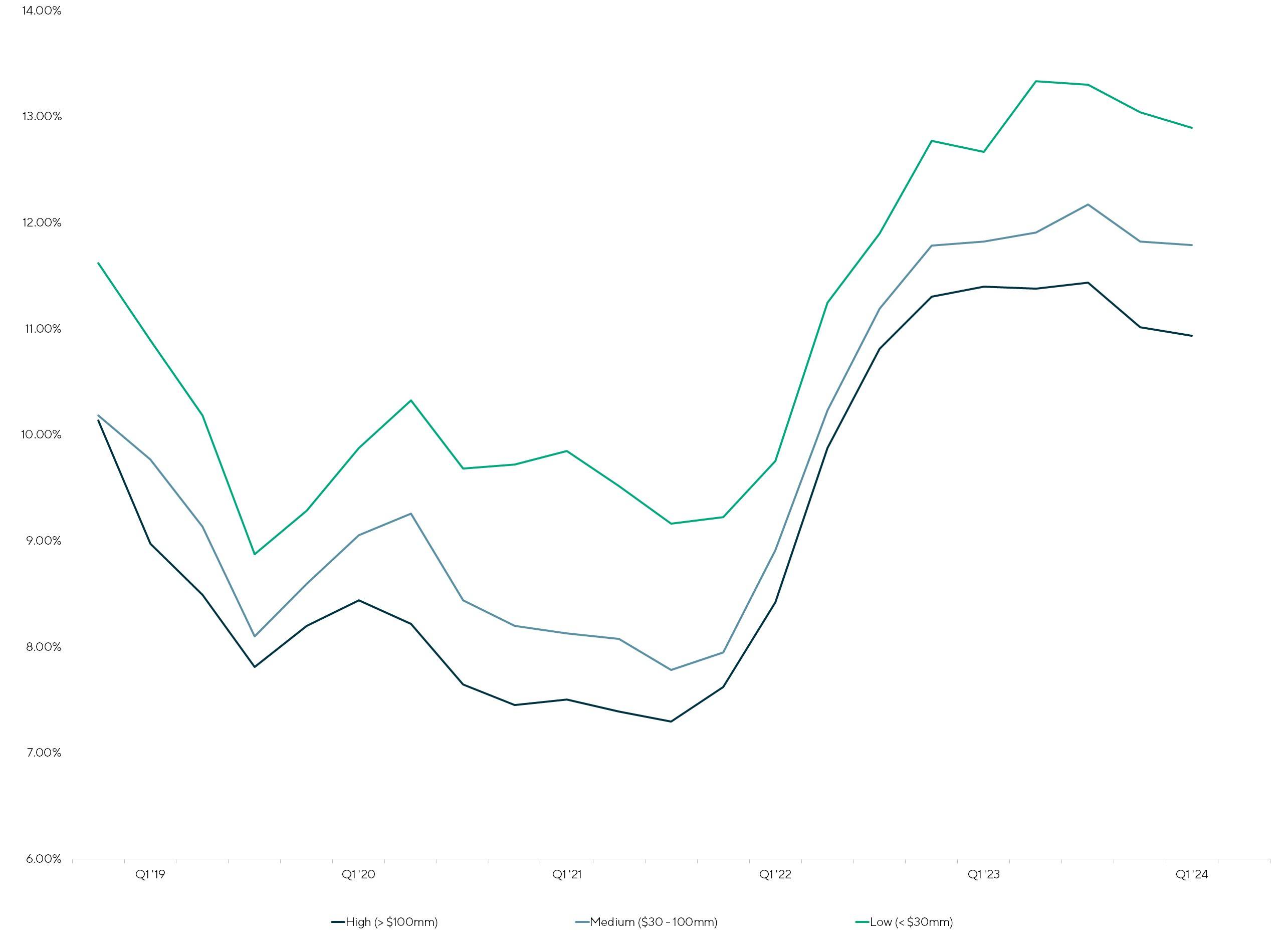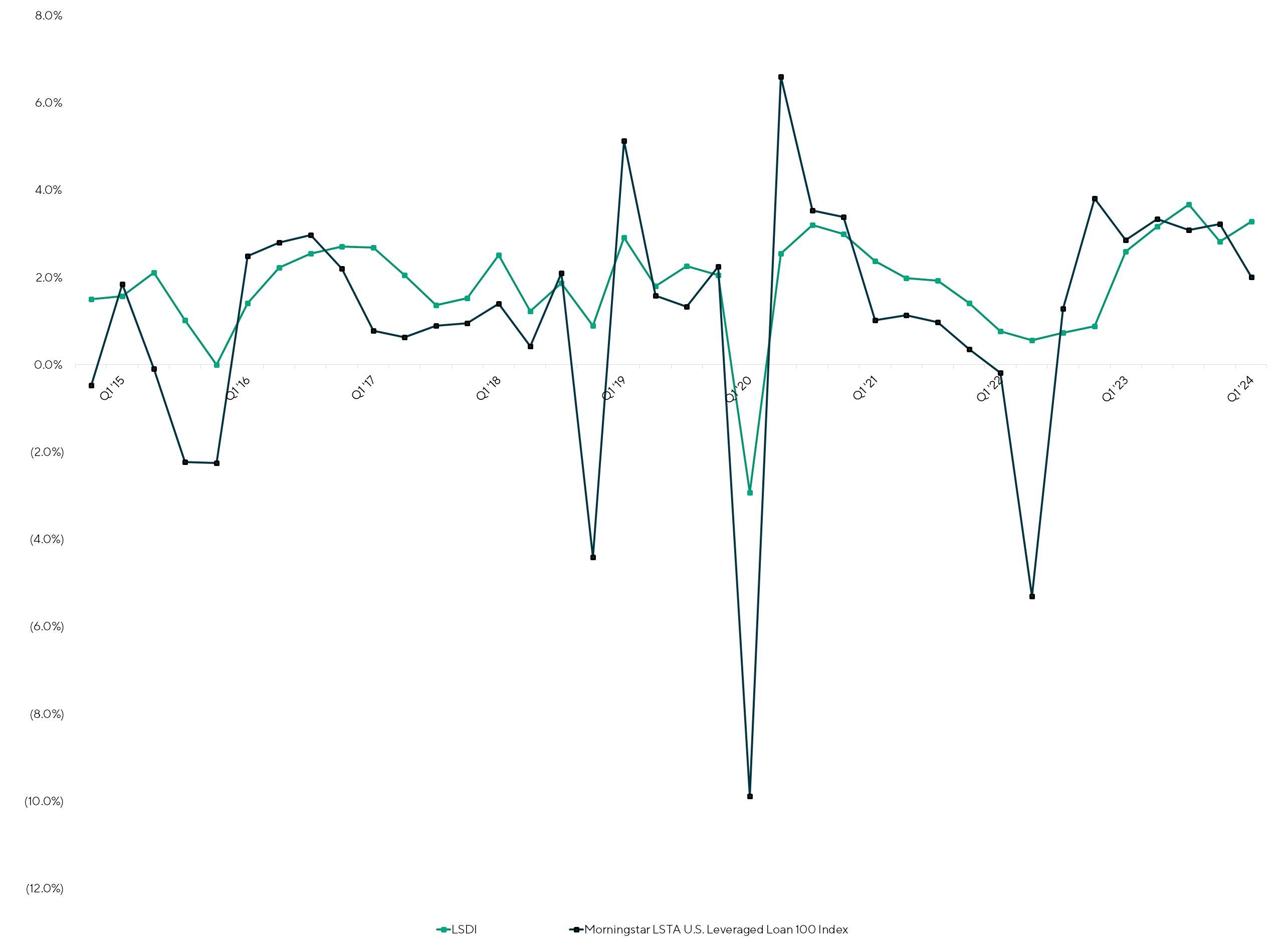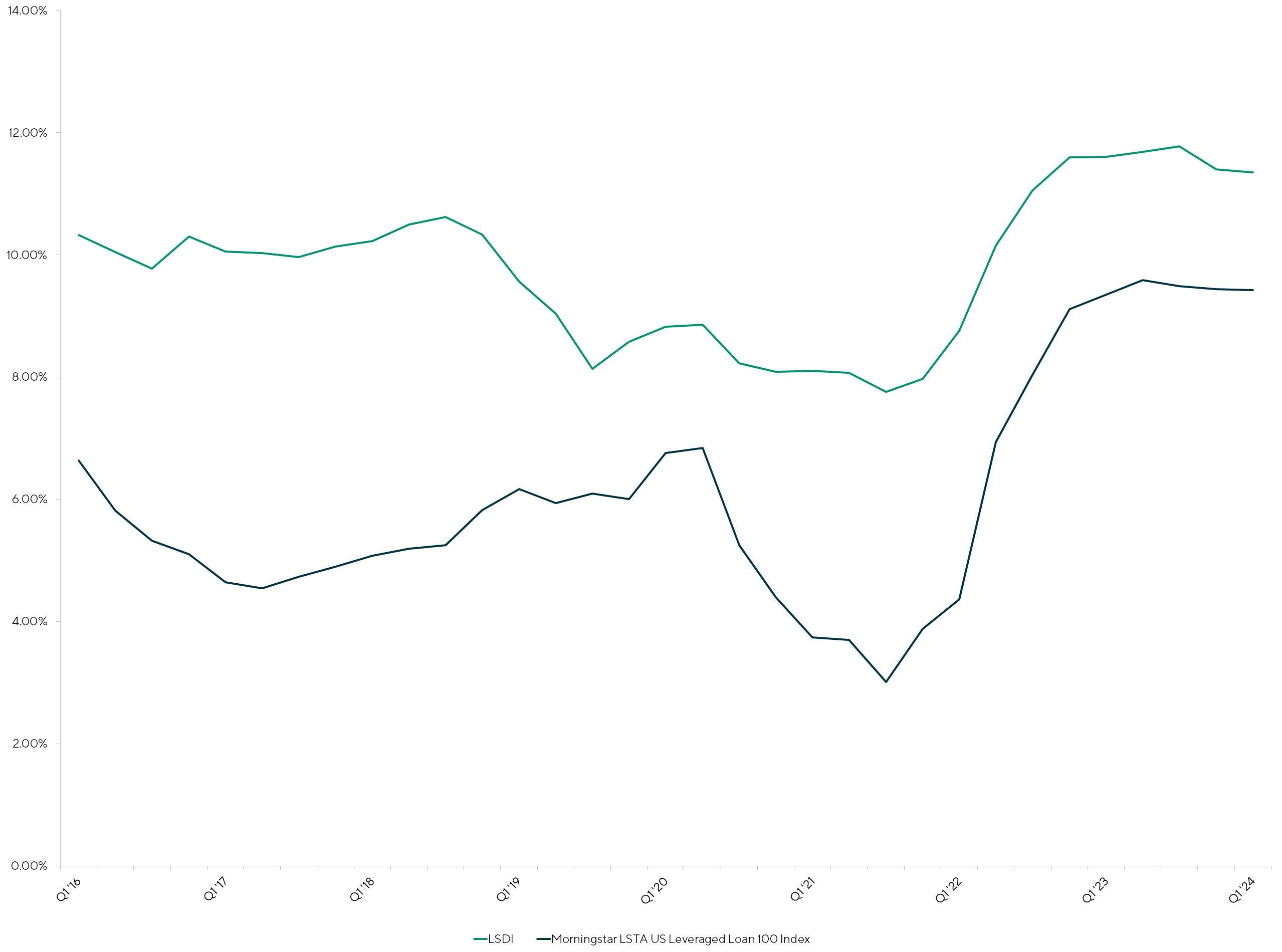 In the first quarter of 2024, the direct lending and broadly syndicated loan (BSL) market continued to experience a contraction in their yield differential with only a 1.9% yield difference relative to the historical average of 3.7%. As competition to deploy capital has continued to increase, returns between the two markets have decreased. Between the end of 2023 and first quarter of 2024, yields in both the direct lending and BSL markets have remained stable, with only minor movements in yields. The LSDI yields contracted five bps since Q4 2023 while BSL yields contracted two bps over the same period.