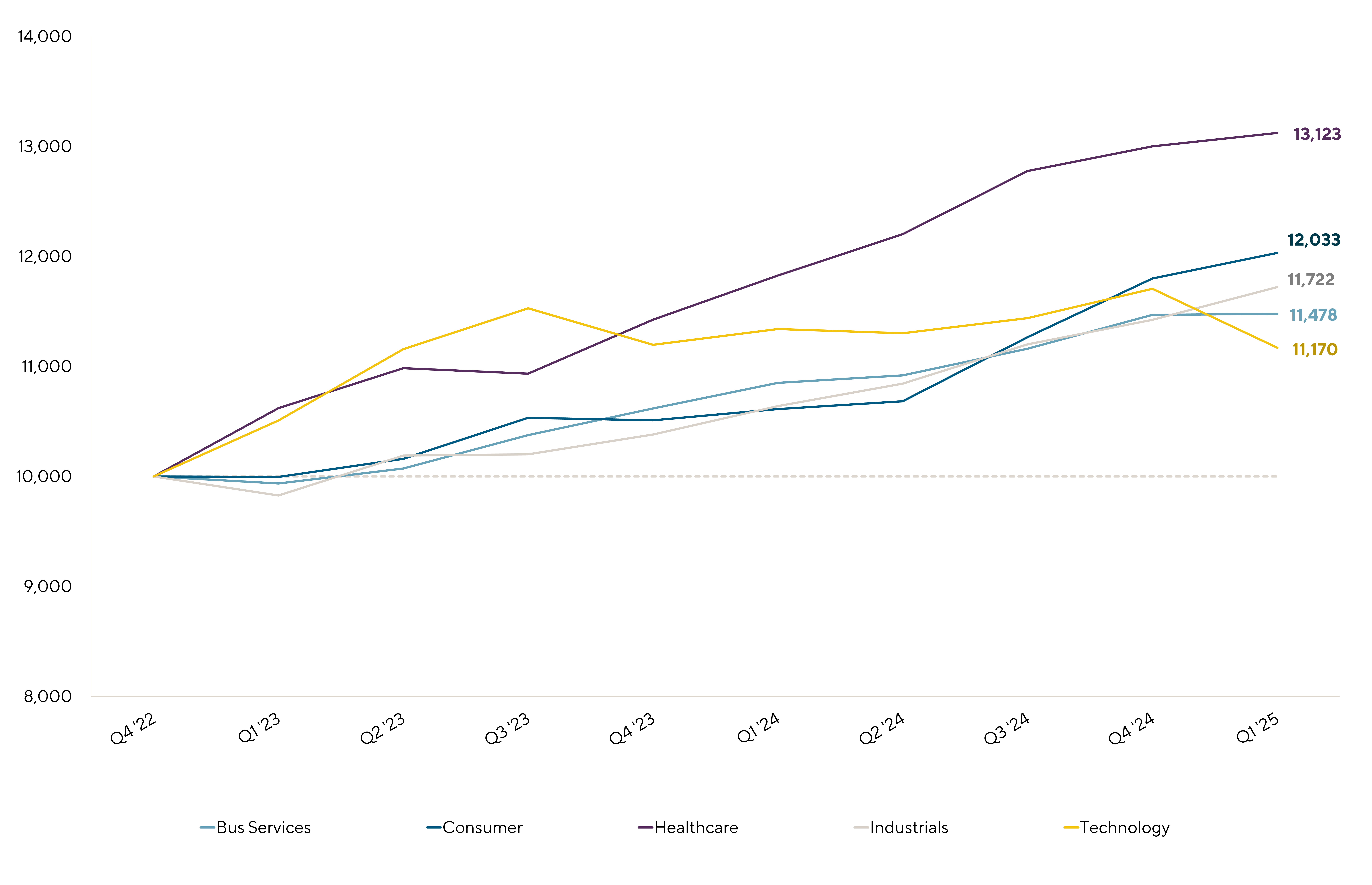 The European Lincoln Private Market Index is the only index which tracks changes in the enterprise values (EV) of privately held European companies. Starting at a value of 10,000 as of December 31, 2020, the PMI inched up to 14,893 or just +0.5% in Q1 2025, its weakest quarter since Russia’s 2022 invasion of Ukraine. Earnings growth added +3.1%, but EBITDA multiple contraction had a negative impact of -2.6%, nearly erasing the gain.