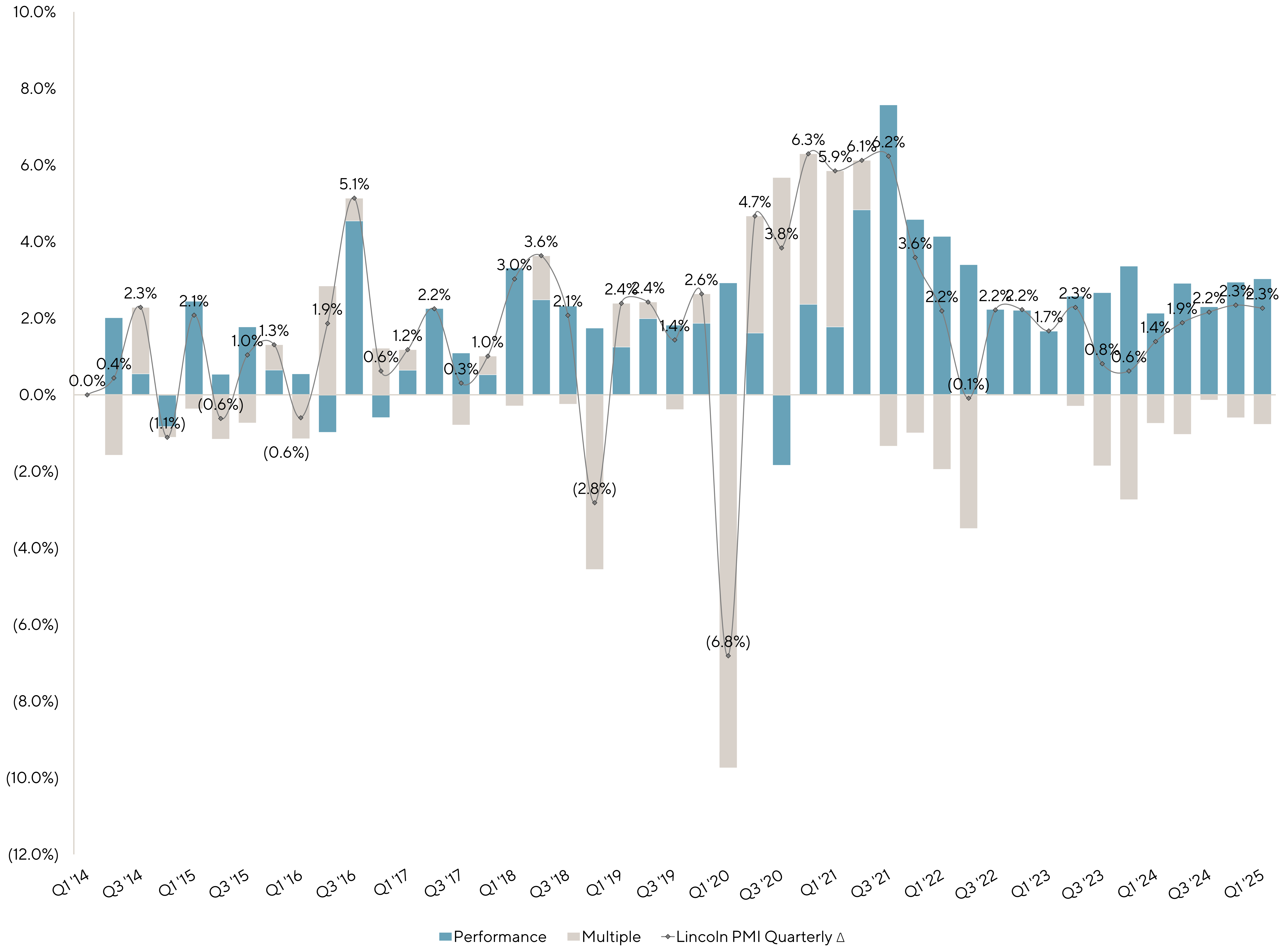 The Lincoln Private Market Index (LPMI), the only index that tracks changes in the enterprise value of U.S. privately held companies, increased by 2.3% during the first quarter of 2025 driven by sustained performance; however, multiple contraction continued to offset earnings growth in Q1 2025.