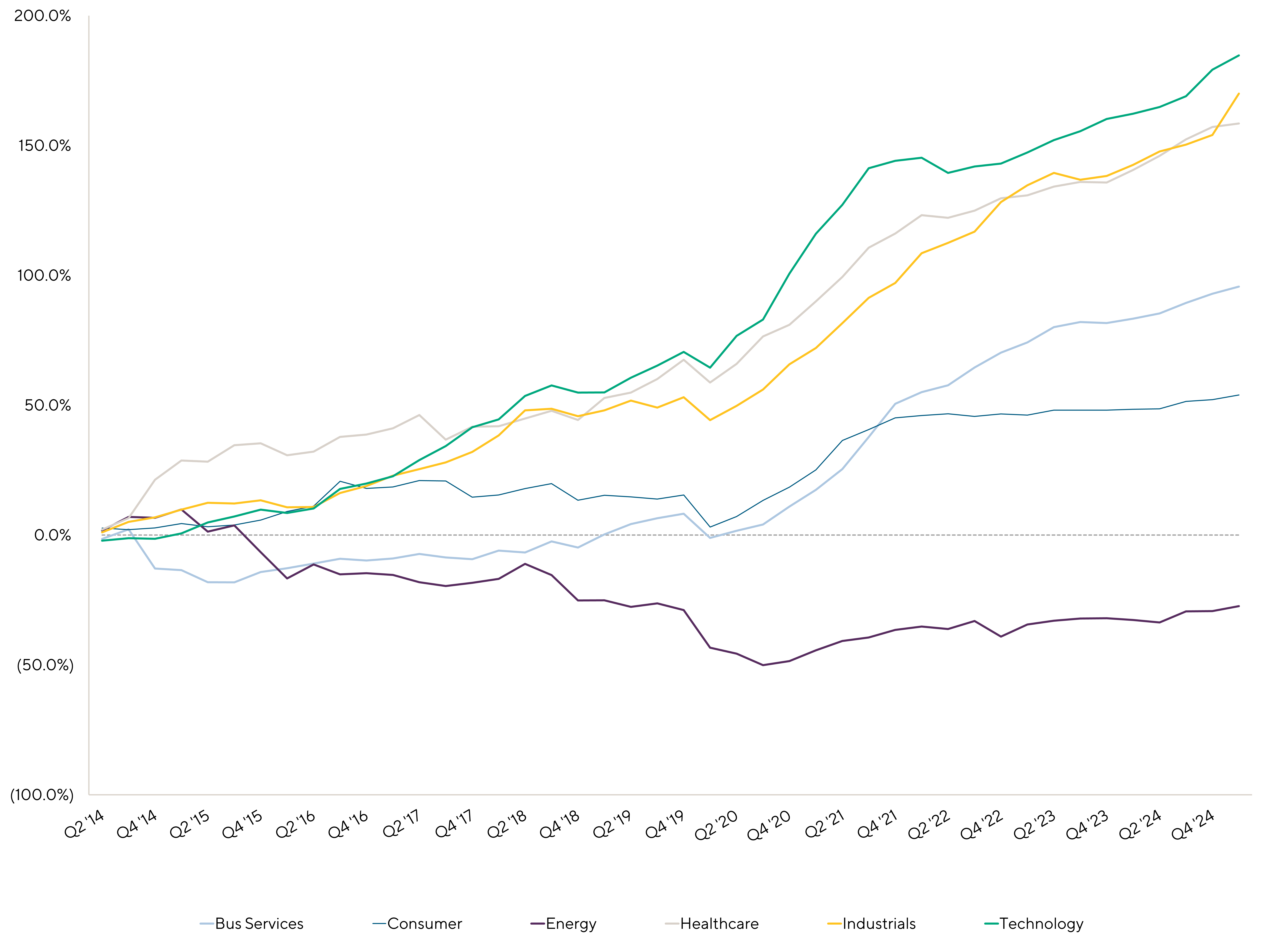 • Consumer companies saw the lowest enterprise value growth of the six industries from the outset of 2025, given more direct exposure to inflationary headwinds and the slower recovery of consumer spending.