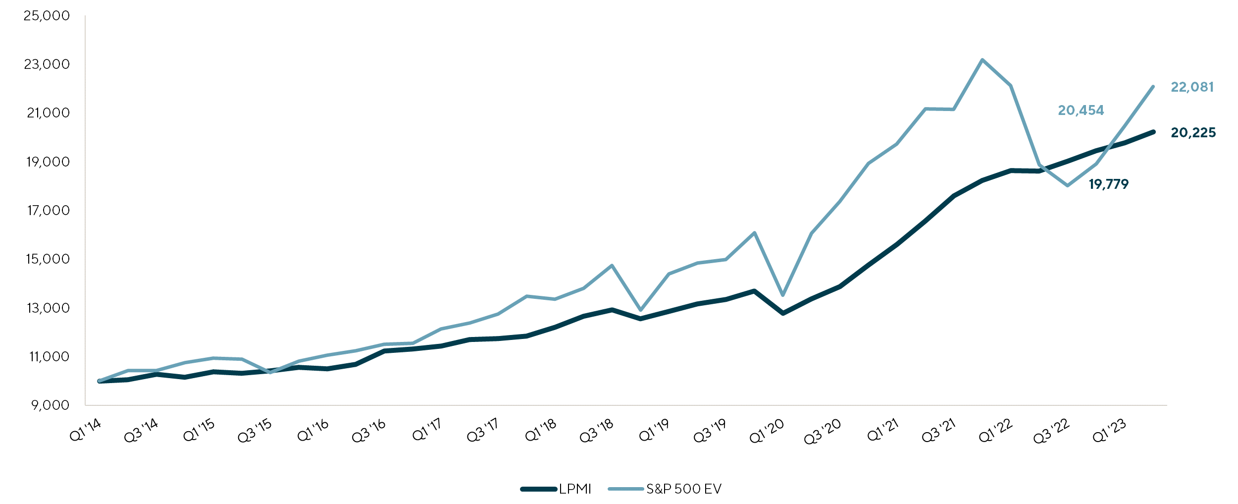 - While both the Lincoln PMI and S&P 500 EV grew in both Q1 and Q2 of 2023, the S&P 500 EV grew more quickly; however, over half of the S&P 500 EV’s strong year-to-date performance was driven by the five trillion-plus dollar public companies.