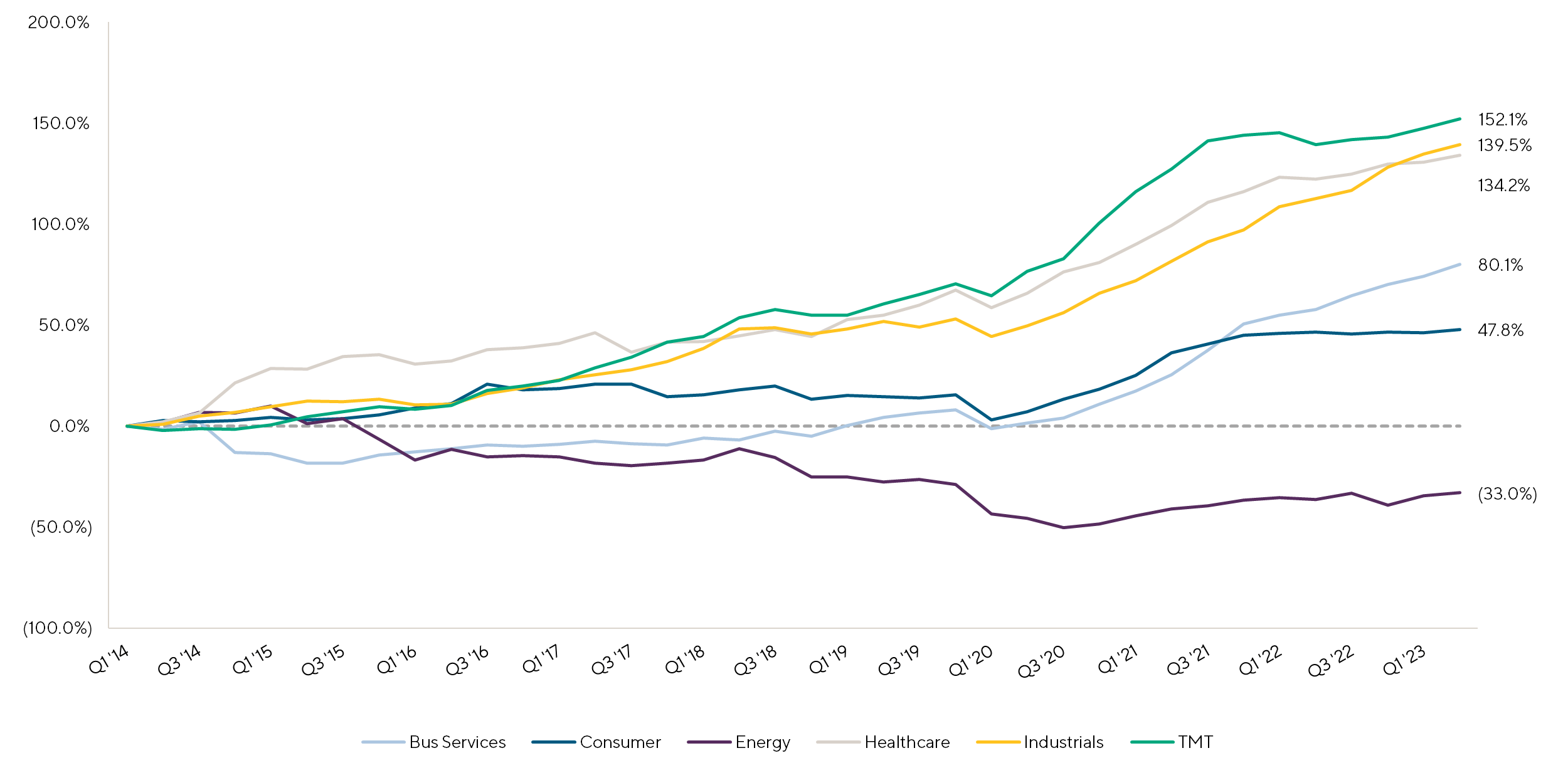 - Industrials and business services have notably outperformed the other industries over the last year thanks in large part to steady growth whereas certain other industries experienced notably greater volatility.