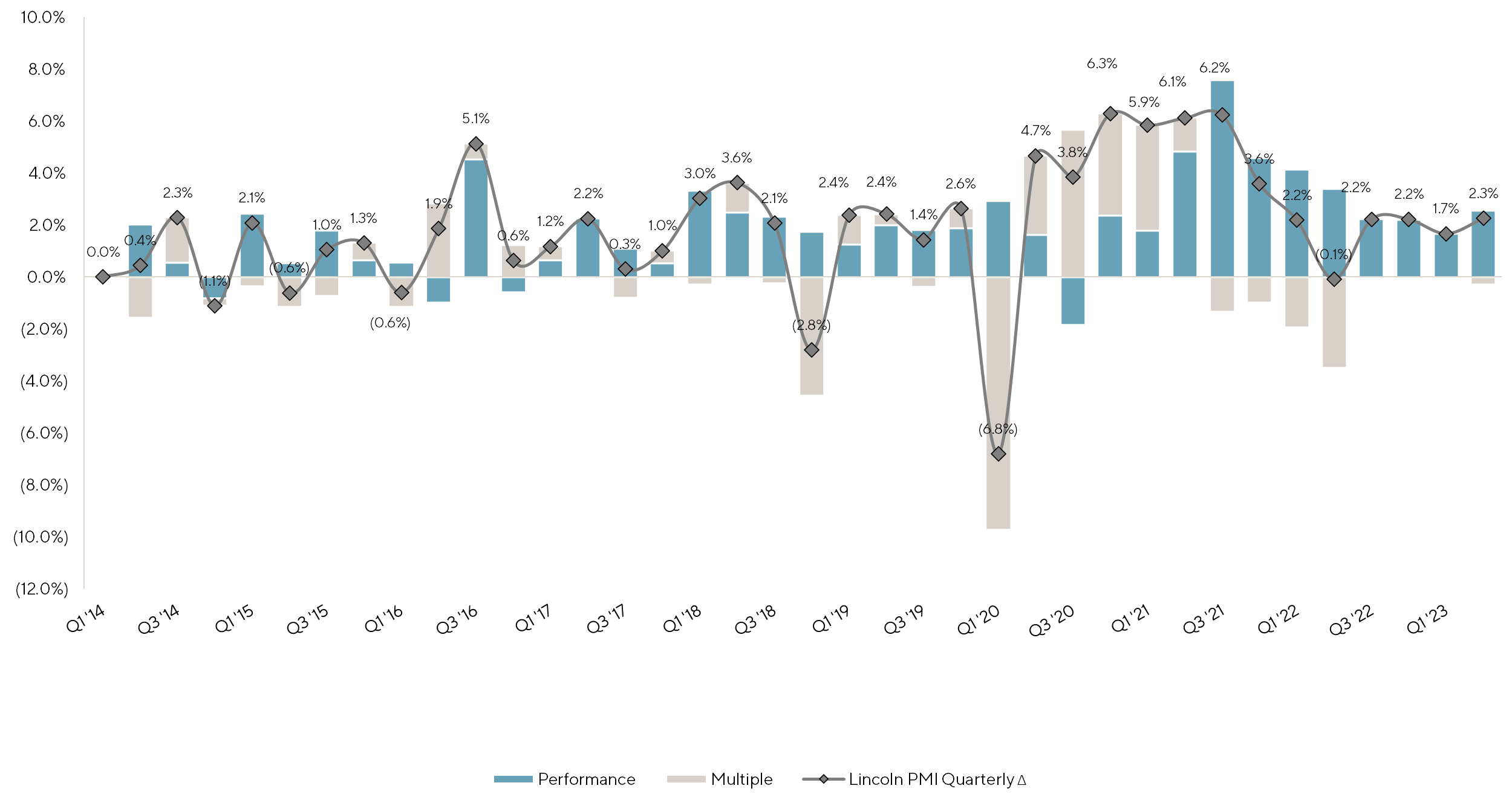 - Since its inception in Q1 2014, the Lincoln PMI has shown that private company enterprise value multiples have been less volatile than public company multiples and that earnings are the primary factor driving long term value creation.