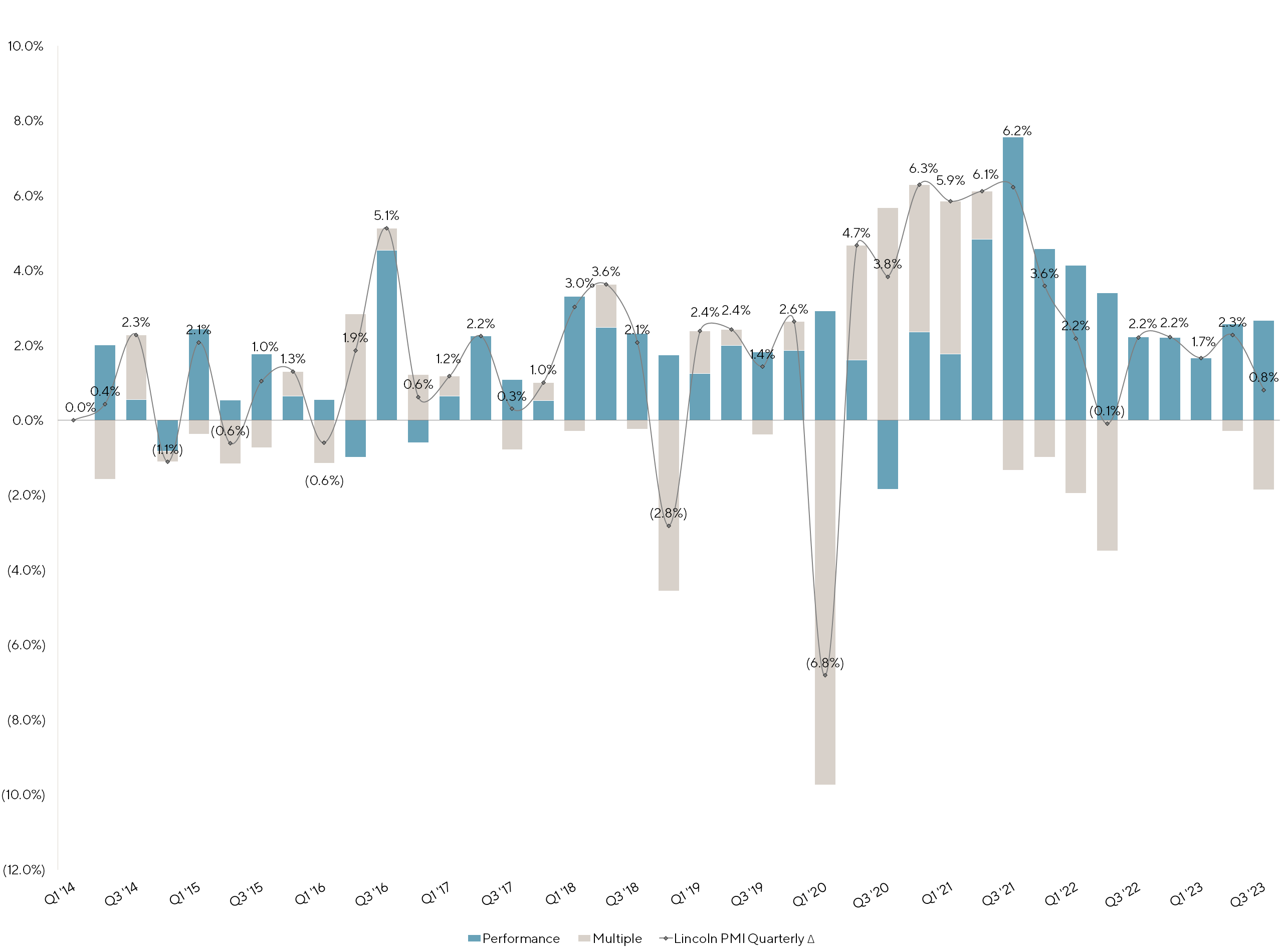 - Since its inception in Q1 2014, the Lincoln PMI has shown that private company enterprise value multiples have been less volatile than public company multiples and that earnings are the primary factor driving long term value creation.