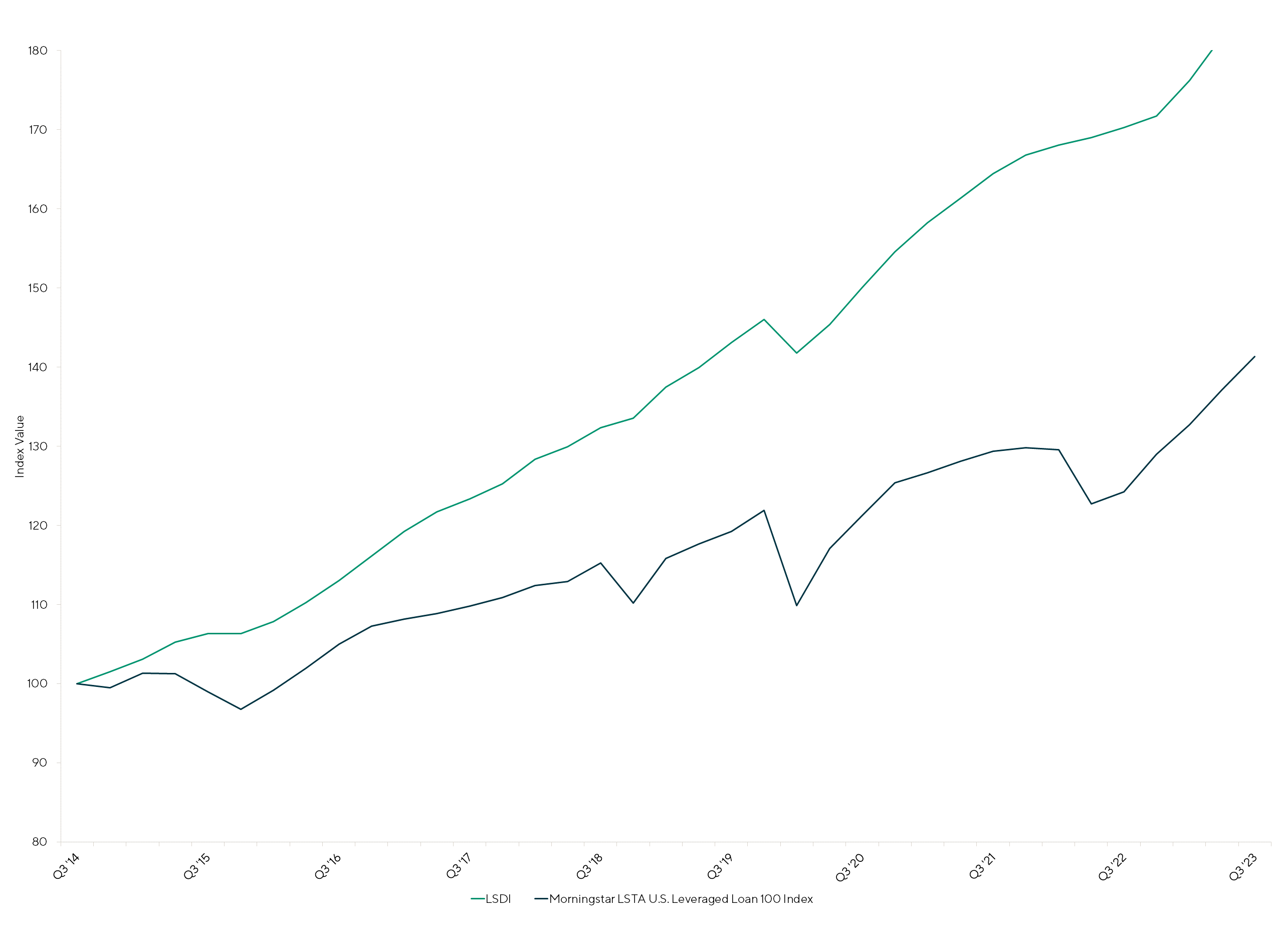 In contrast to the Morningstar LSTA U.S. Leveraged Loan 100 Index which is comprised of companies borrowing in the BSL market, the constituents in the Lincoln Senior Debt Index are virtually all companies borrowing in the direct lending market.