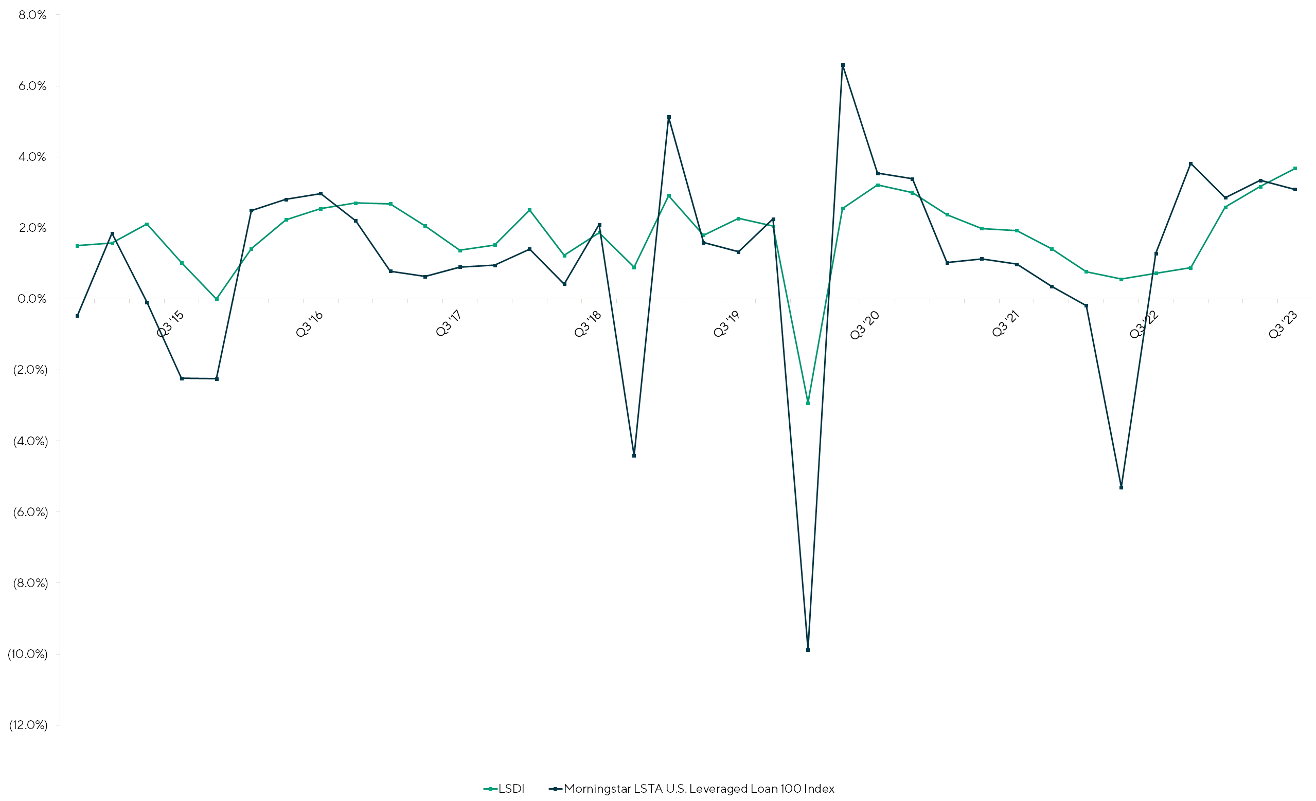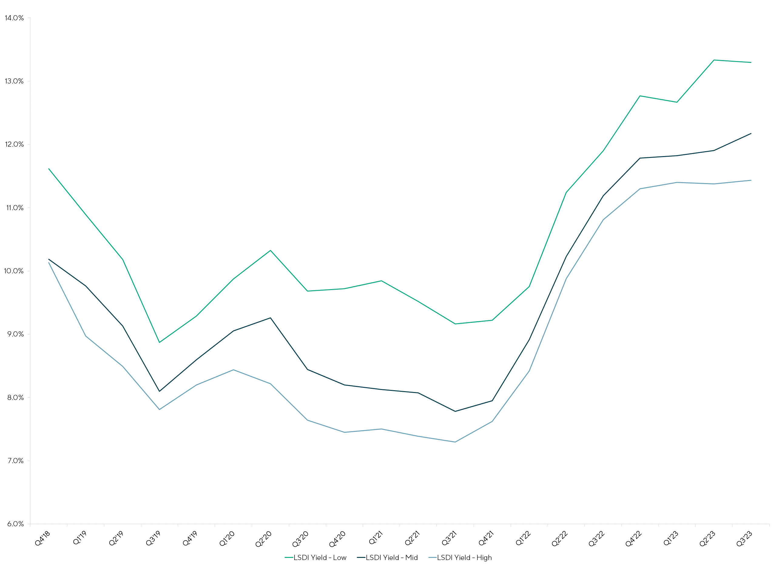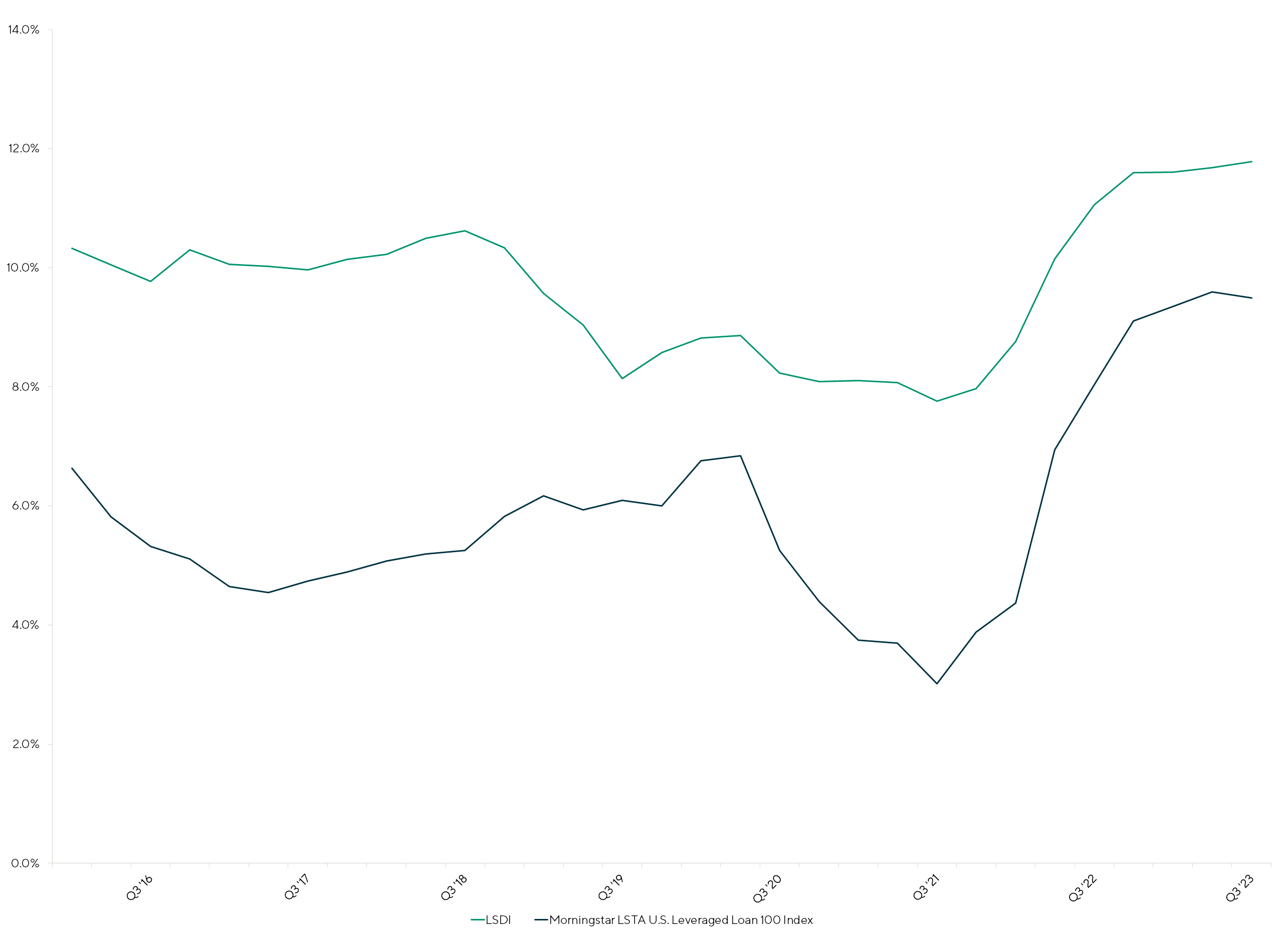 In Q3 2023, the direct lending and broadly syndicated loan (BSL) market continued to experience a contraction in their yield differential with only a 2.3% yield difference relative to the historical average of 3.8%. Despite the contraction relative to the historical average, the yield differential widened by 20 BPS relative to the Q2 2023 comparison. LSDI yields have risen from 11.1% to 11.8% (0.7%) from September 30, 2022, to September 30, 2023, whereas BSL yields have risen from 8.0% to 9.5% during this same period (1.5%).