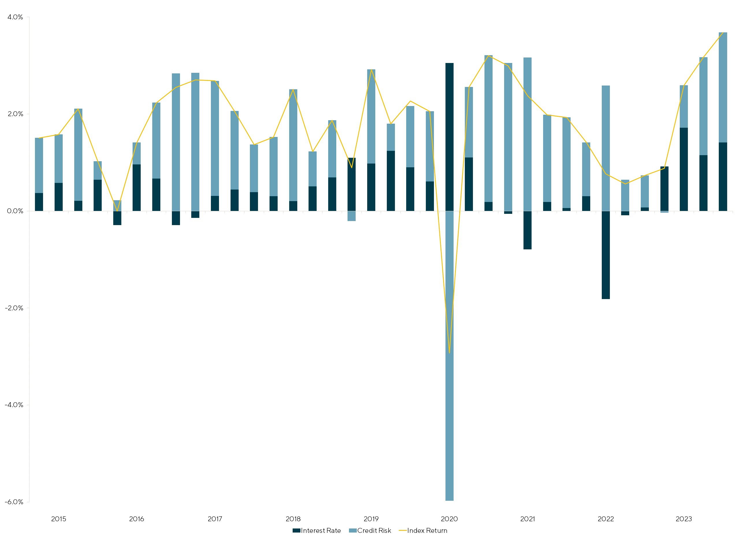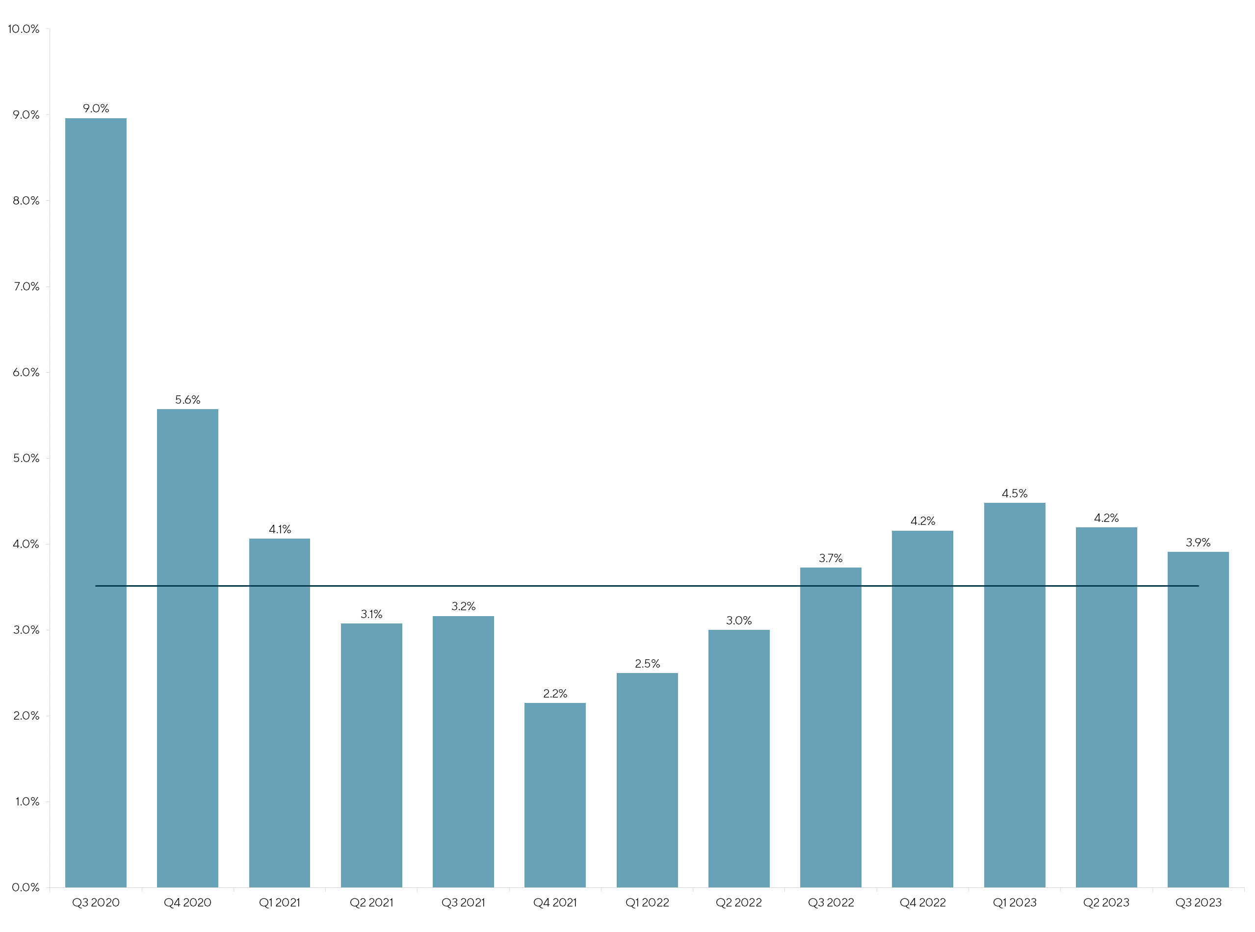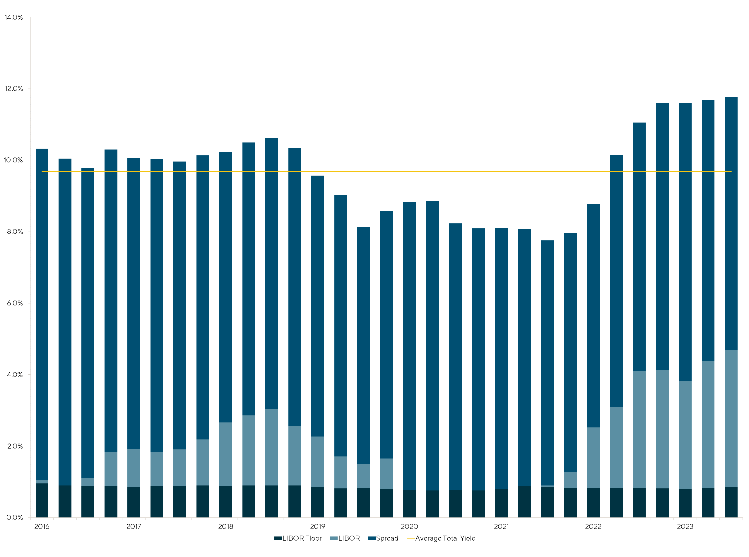 In Q3 2023, the direct lending and broadly syndicated loan (BSL) market continued to experience a contraction in their yield differential with only a 2.3% yield difference relative to the historical average of 3.8%. Despite the contraction relative to the historical average, the yield differential widened by 20 BPS relative to the Q2 2023 comparison. LSDI yields have risen from 11.1% to 11.8% (0.7%) from September 30, 2022, to September 30, 2023, whereas BSL yields have risen from 8.0% to 9.5% during this same period (1.5%).